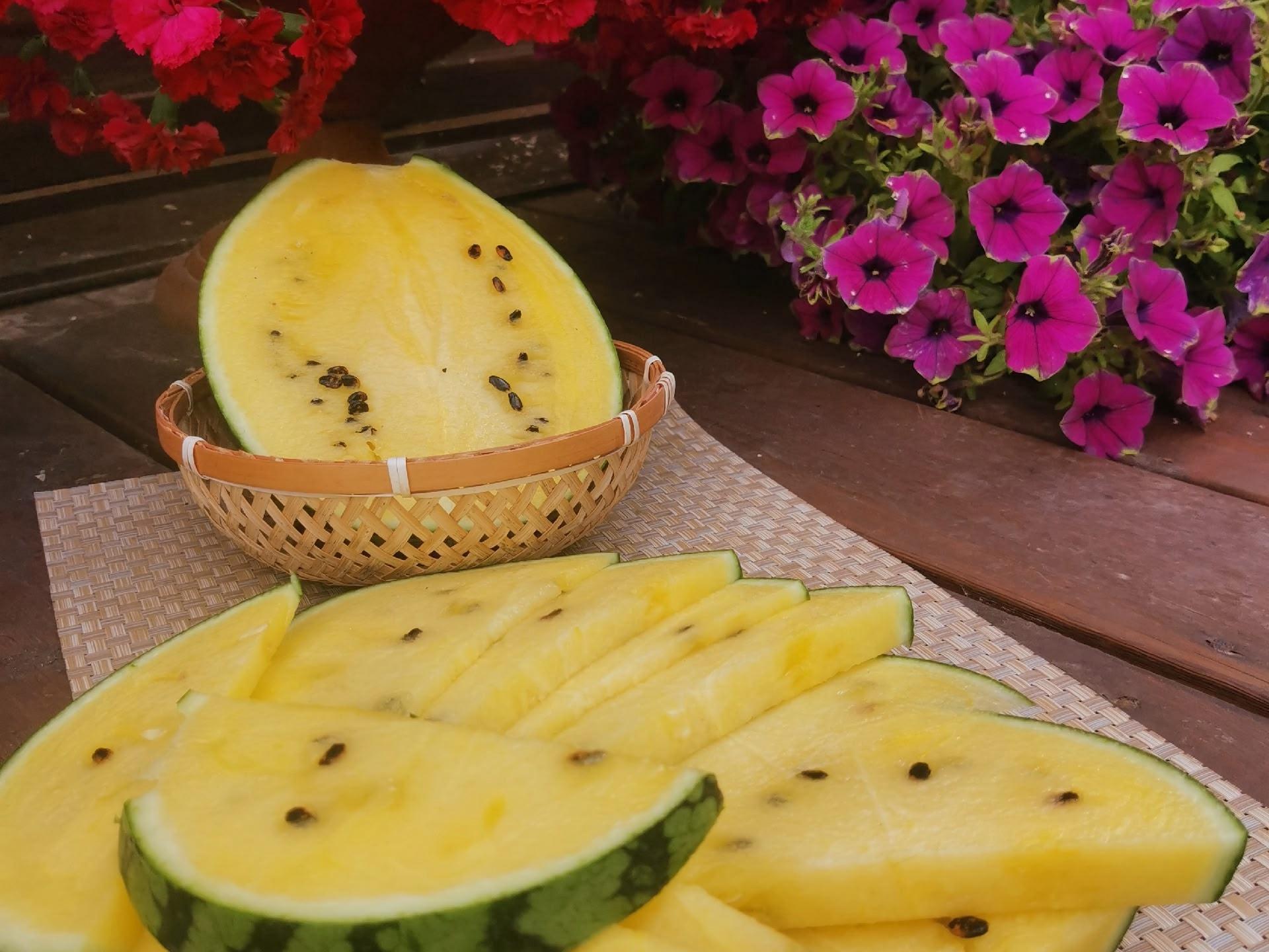 Both red‑fleshed and yellow‑fleshed watermelons ripen under her northern greenhouse conditions.