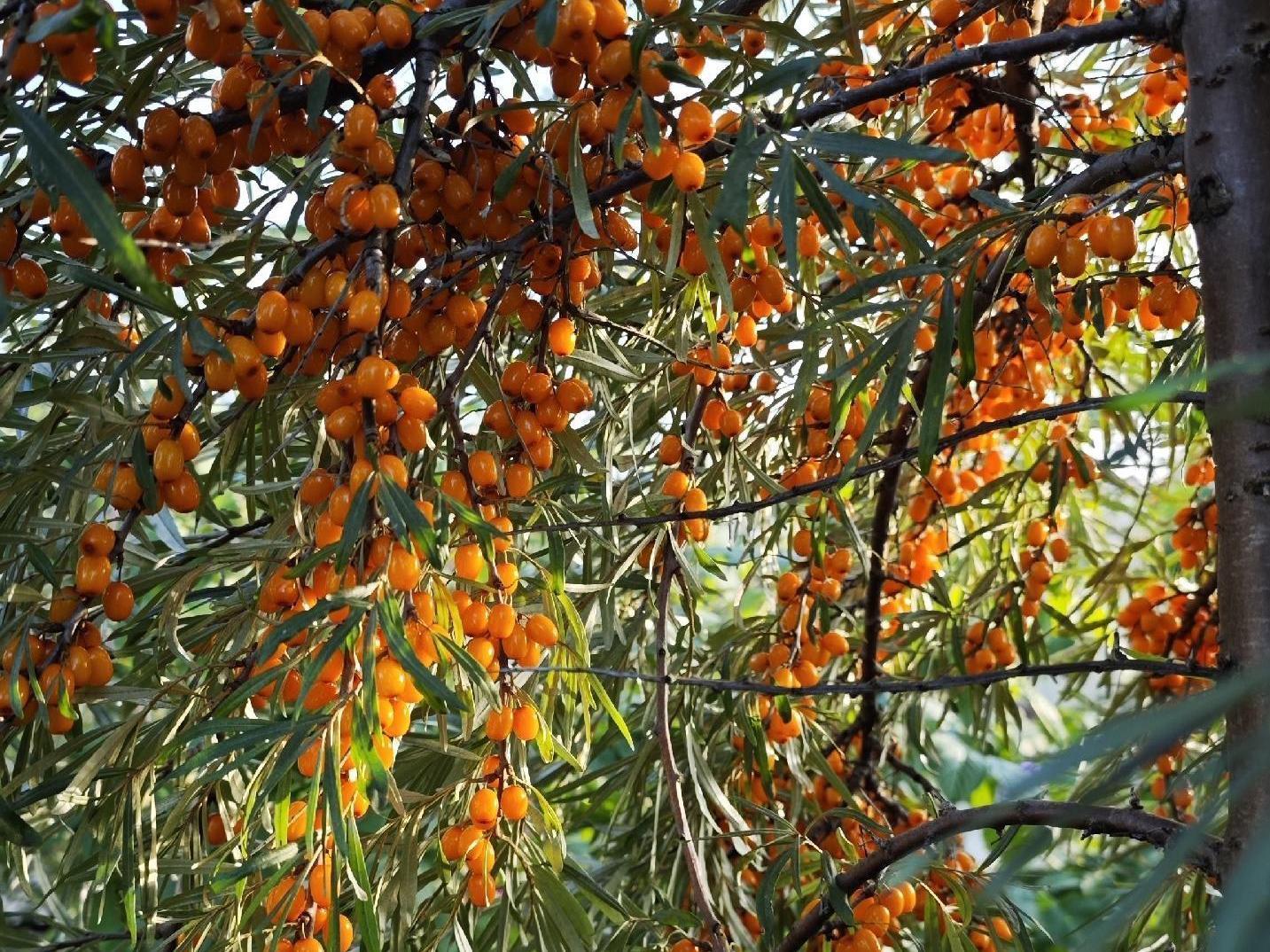 Vigorous sea buckthorn spreads aggressively, fruiting heavily and colonizing available space.