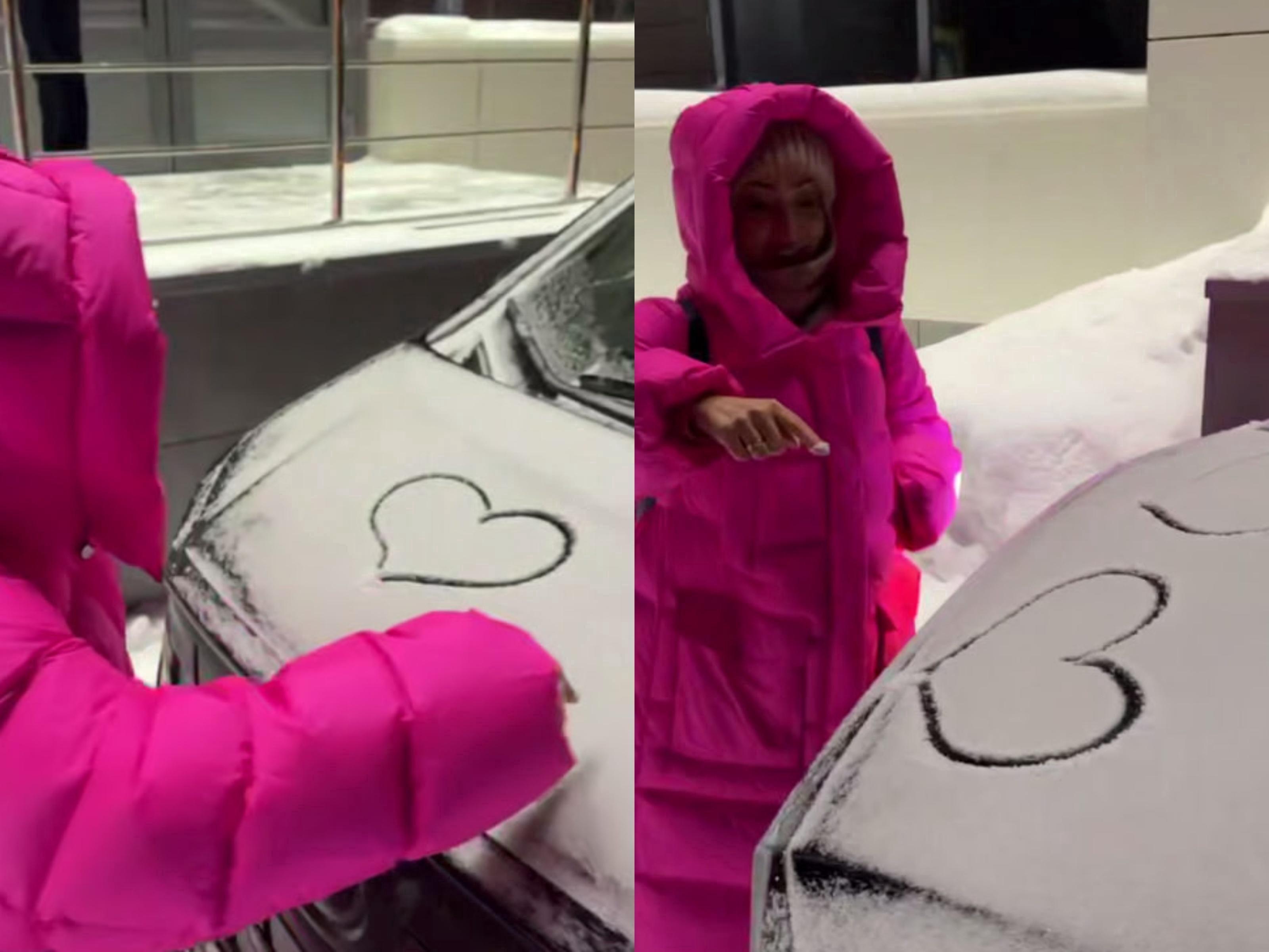 On the snowy hood of the car, Eteri Beriashvili drew three hearts. Larisa Dolina commented on it: «Such a beautiful and touching sign Eteri left on my car yesterday…. My dear and beloved, I am infinitely grateful for EVERYTHING! I love you with all my heart!»
