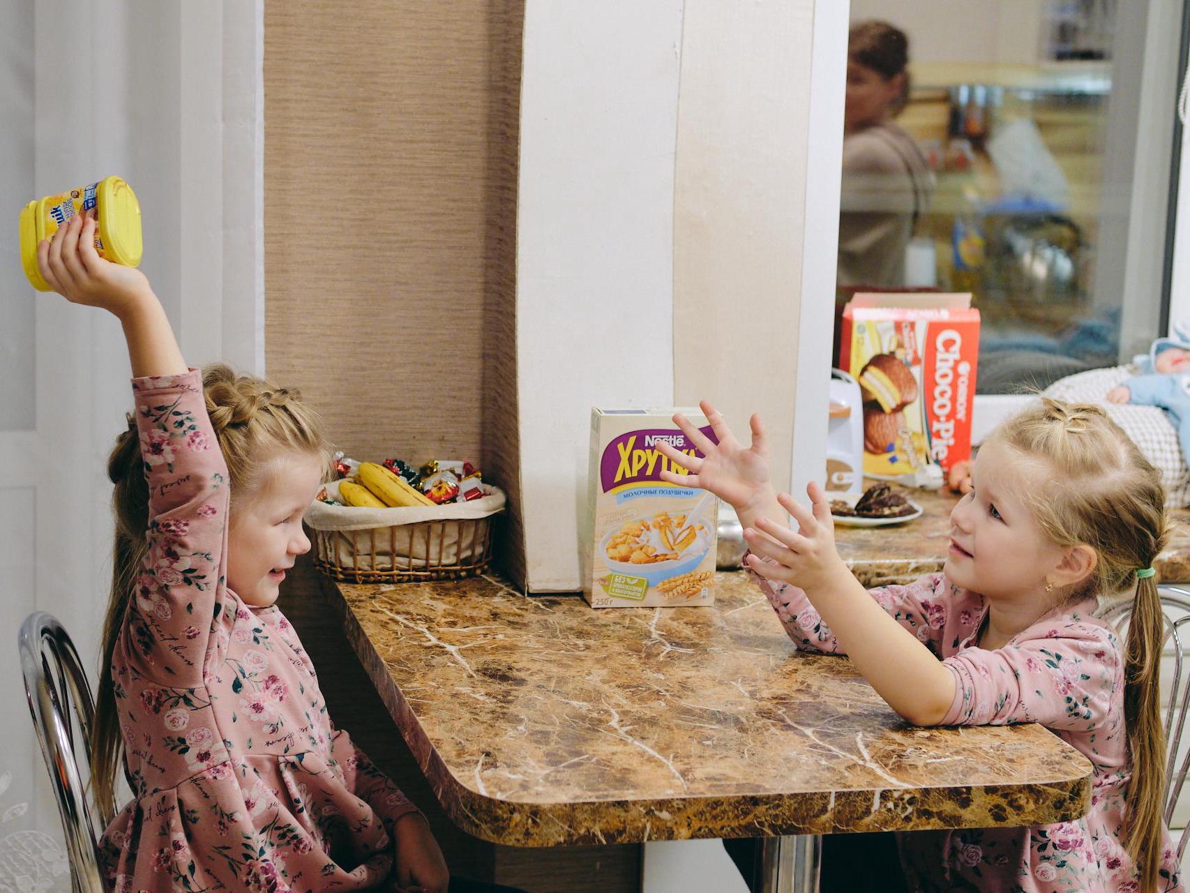 It«s noisy this evening in a small apartment in one of the houses in Semibratovo. Two restless twin sisters—Ulyana and Vasilisa—are sharing something in a sisterly fashion on a large beige sofa.