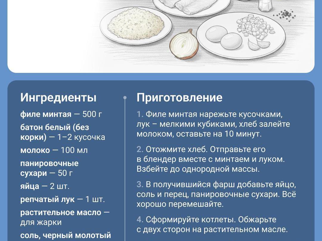 Pollock is a lean, dietary fish that contains a lot of folic acid, which is responsible for the growth and development of the circulatory and immune systems. Moreover, it is one of the most budget-friendly options. Tasty and healthy fish cutlets are sure to be a hit at a family dinner. They can be served with mashed potatoes or a vegetable salad. Ketchup, mayonnaise, or tartar sauce are suitable as sauces.
