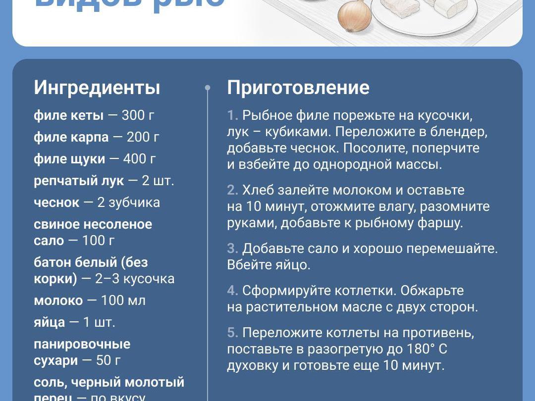 Why stop at one fish when you can make cutlets from several types at once. Don«t worry, it won»t take much time. But the result will pleasantly surprise you. You can choose the fish to your taste and budget. In our recipe, we use chum salmon, carp, and pike. But salmon, sea bass, pikeperch, or blue whiting will also work.