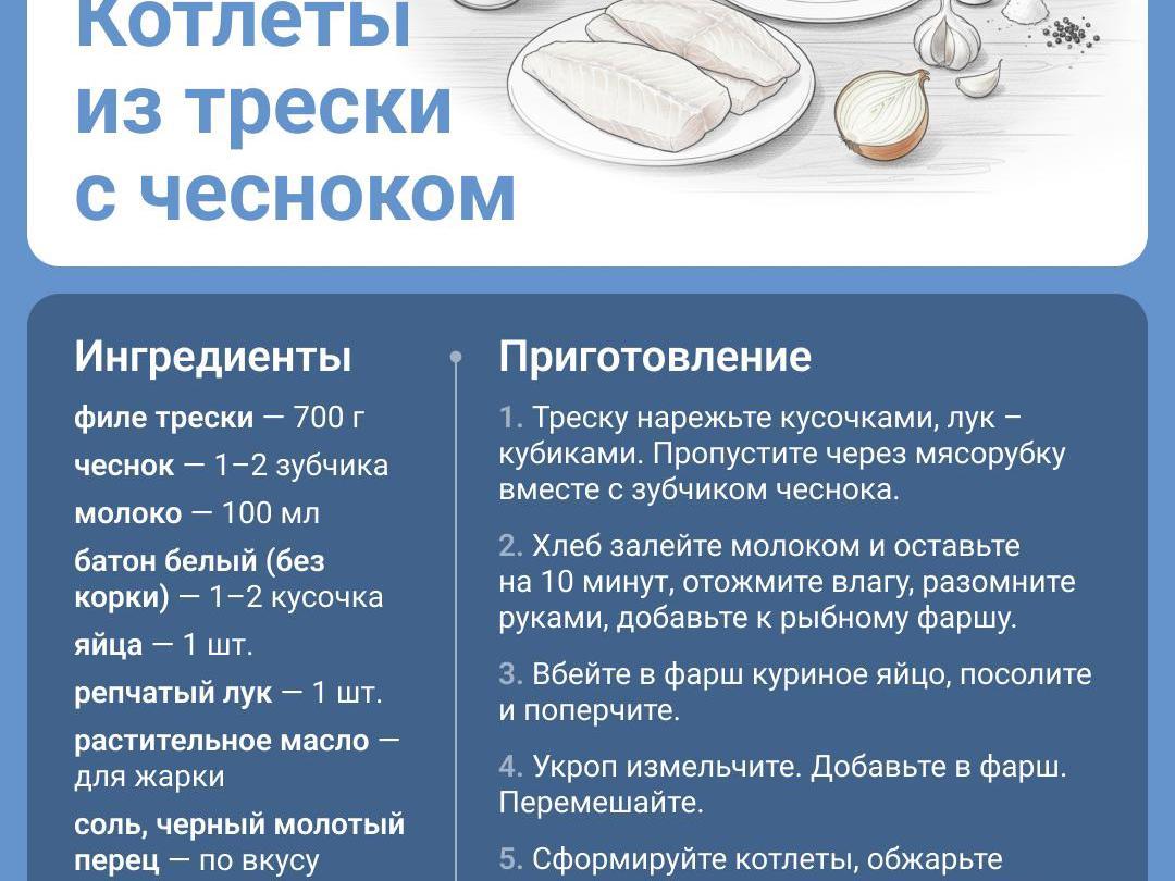 Cod cutlets turn out juicy and tender, primarily due to the addition of a clove of garlic to the mince. Dill will give the dish aroma. The cutlets are tasty both hot and cold. They can be served with boiled potatoes or a cucumber and tomato salad.