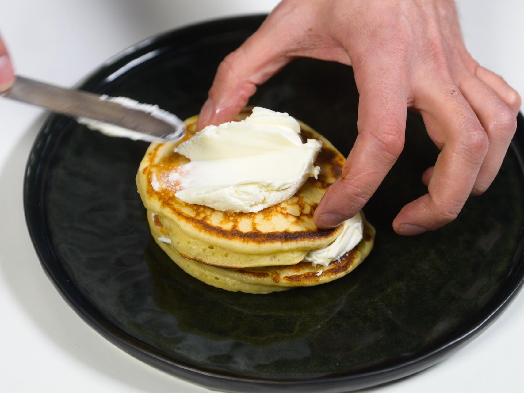 Add baking soda and flour. Mix well again. The batter should be thick but pourable (like for regular pancakes).