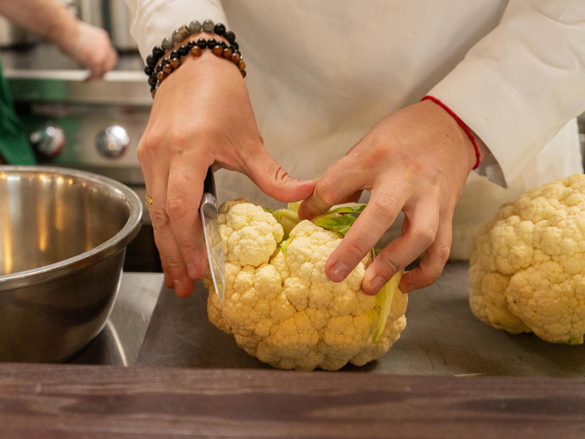 Let«s start by preparing the main ingredients. Peel and finely chop the onion. Also peel and grate the carrot. Separate the cauliflower into small florets, rinse under running water, and drain well in a colander.