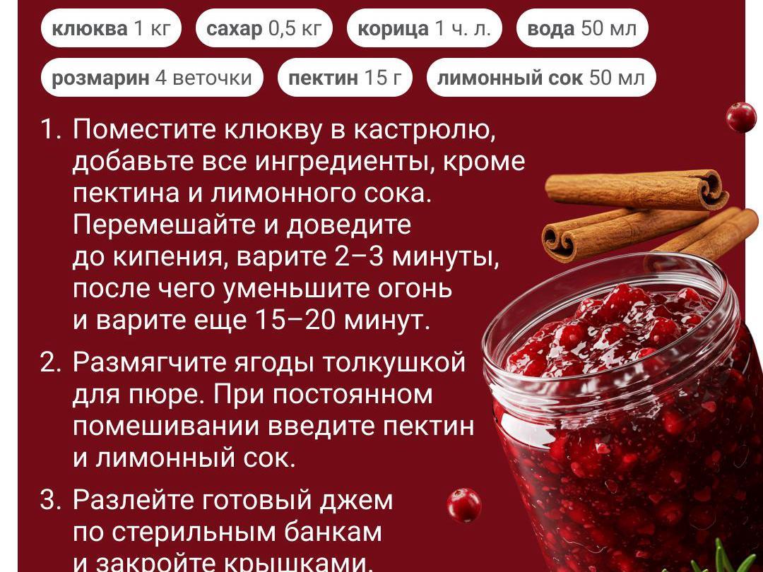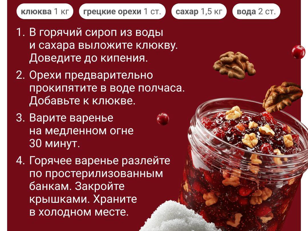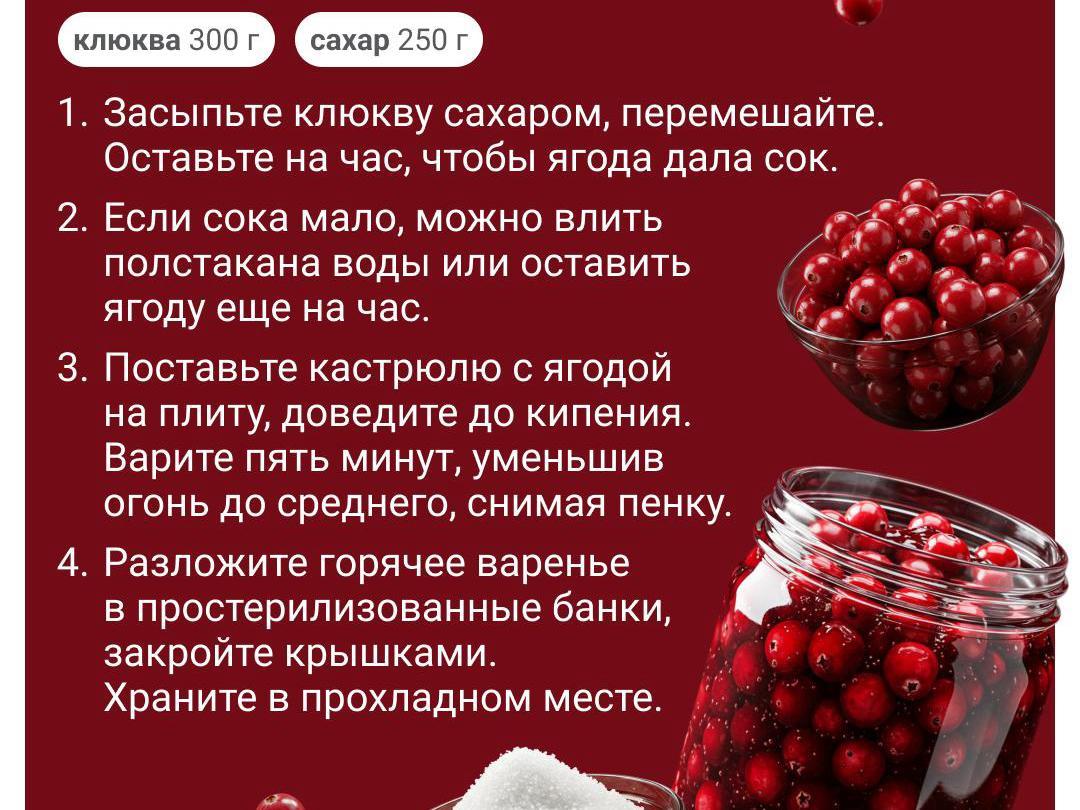 Autumn is cranberry time. This northern berry — a treasure trove of vitamins. You can cook delightful preserves that will support your immune system on long, cold evenings — cranberries retain their beneficial properties even after heat treatment. Put up cranberries for later and they will beautifully complement various meat dishes and salads, and adorn baked goods and desserts. We offer 7 simple recipes that take very little time to make.