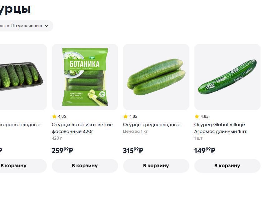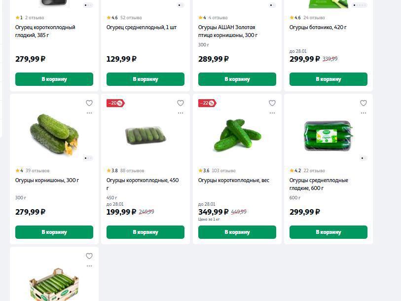 - Auchan offers mid-fruited cucumbers for 129.99 rubles (about $1), other varieties — more than 200 rubles (about $2), with discounted items at 349.99 rubles (about $4).