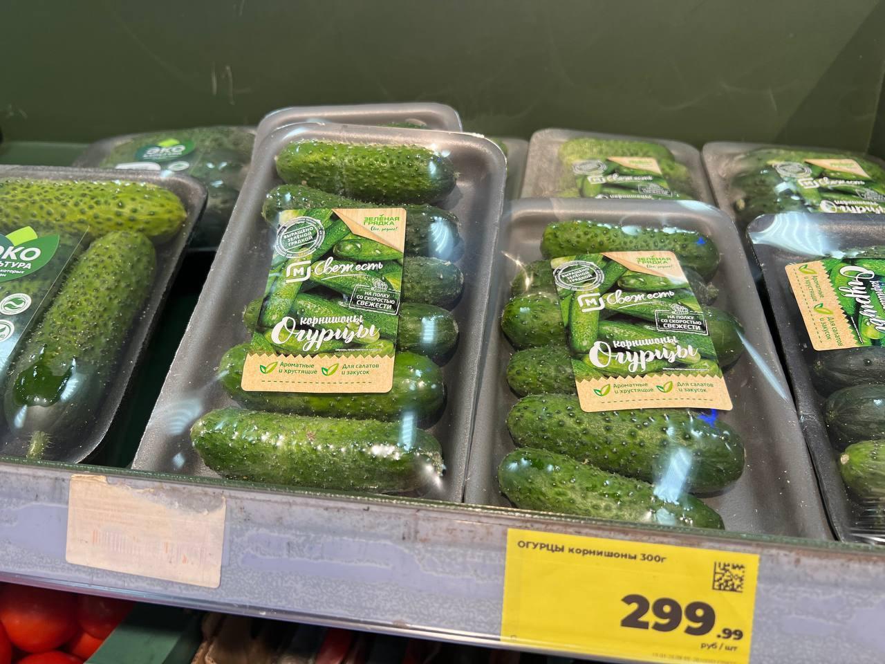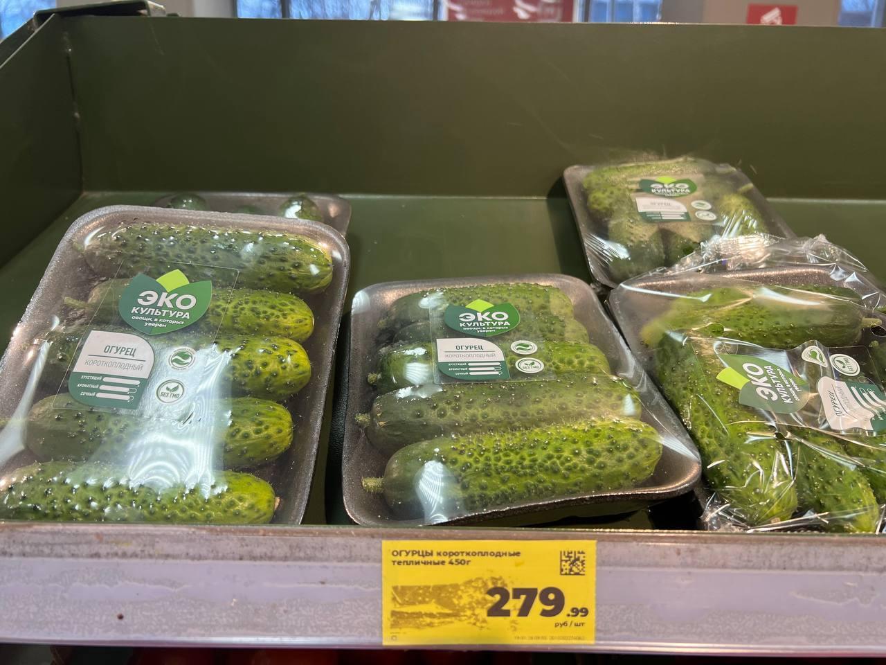 fresh packaged cucumbers «Botanika» (420 g): about 265.99 RUB (approx. $3 at current rates);