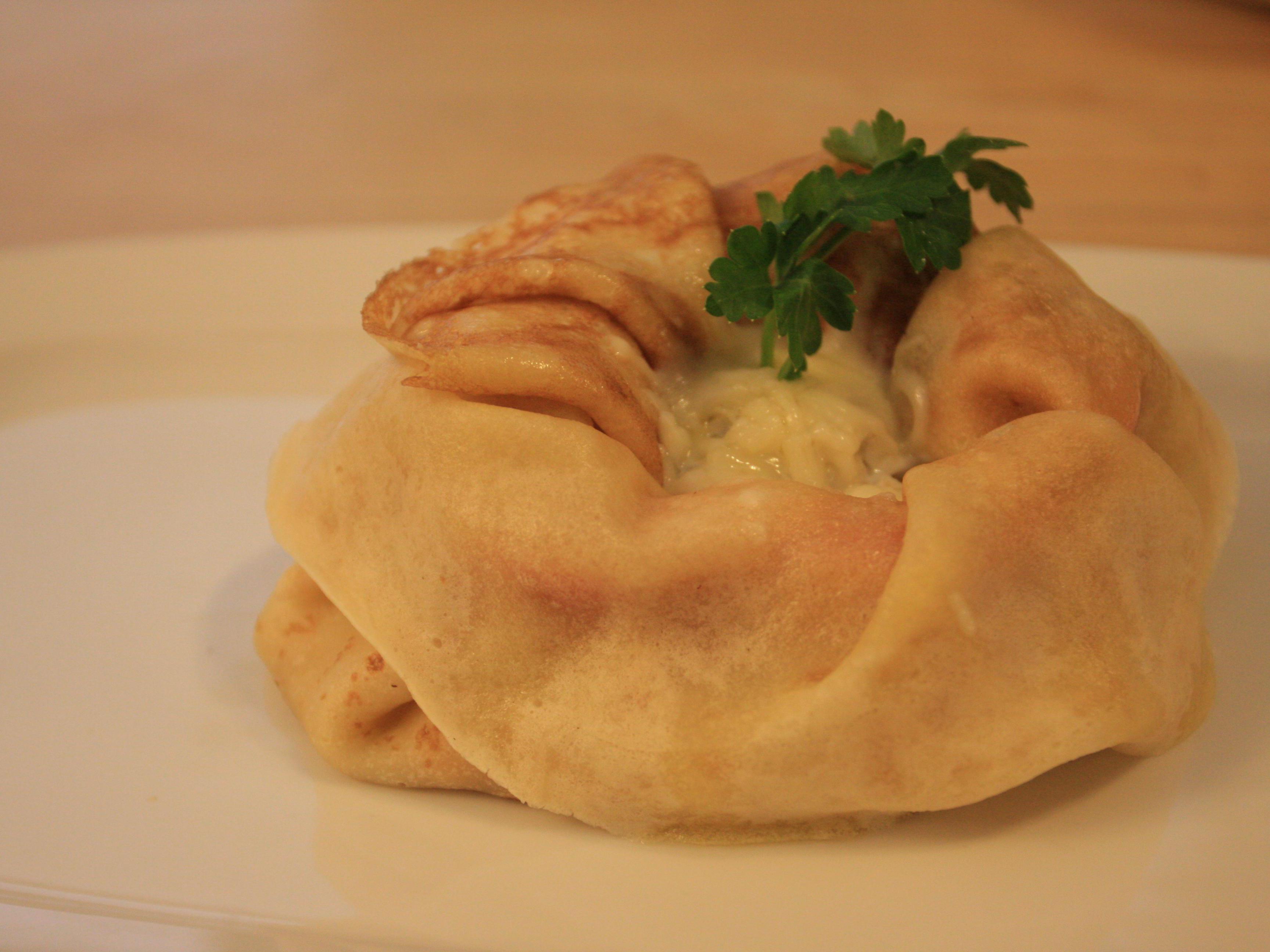 5. On a warm pancake, spread a layer of cheese, top with warm pear wedges. Sprinkle with walnuts and drizzle with honey. Fold into an envelope.