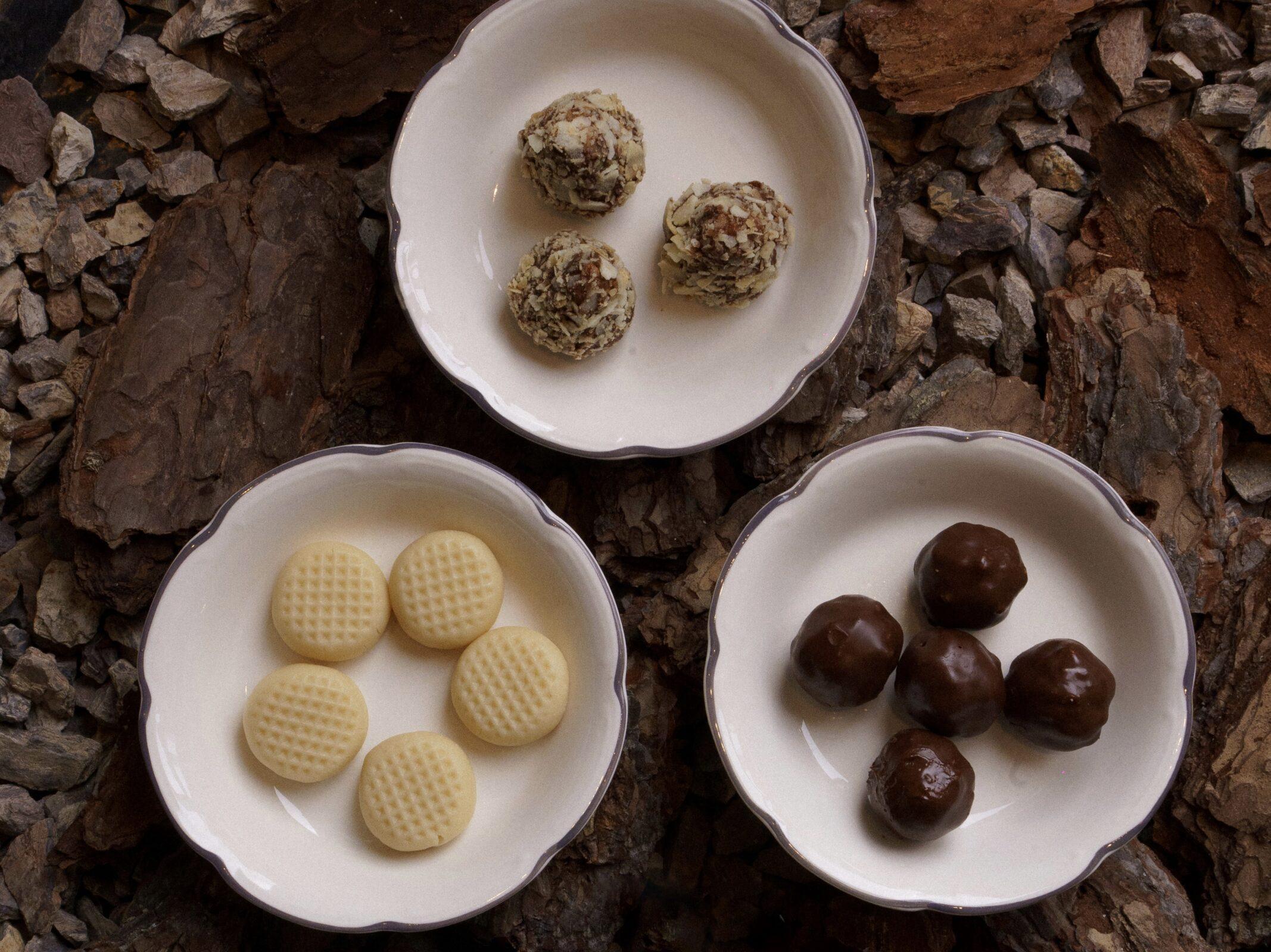 A tasting set features chicken pate, shrimp oatmeal, candies, and the Mokosh cocktail.