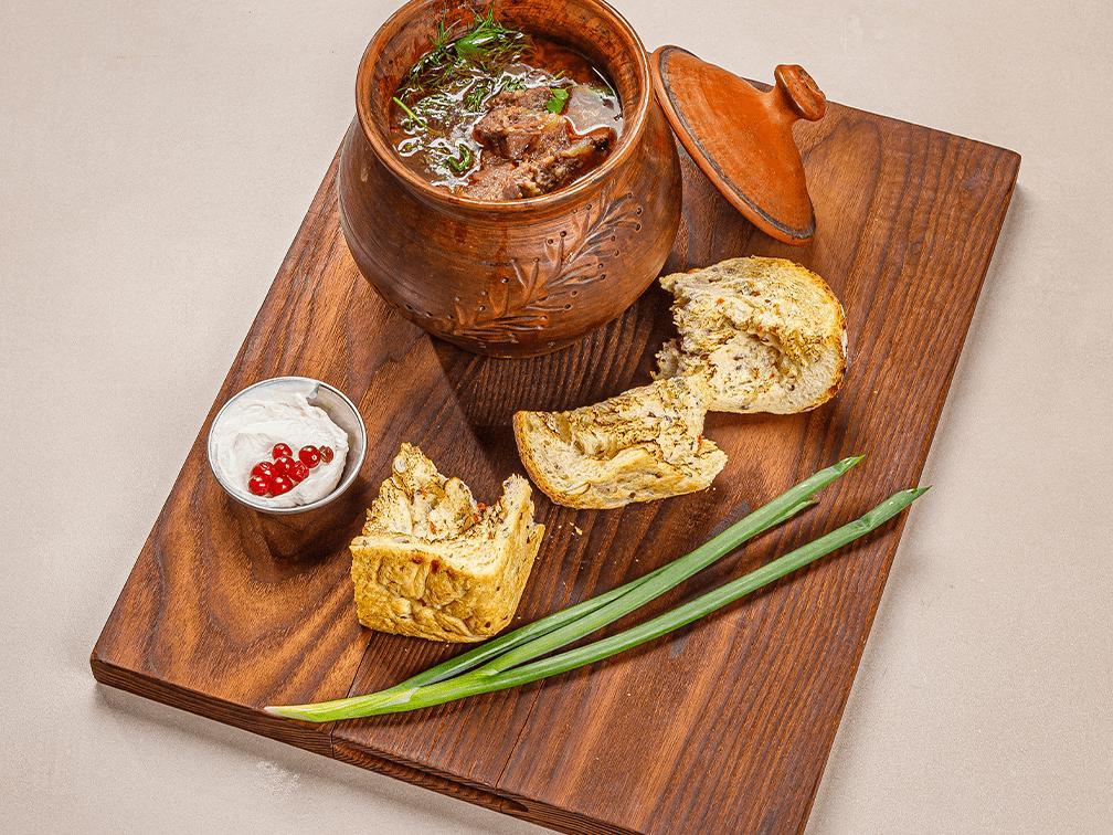 Dishes on offer include stewed meat, cutlet, shchi, herring under fur coat, and olivier salad.