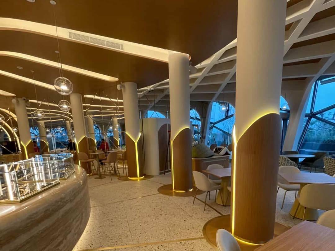 Judging by the photos, the interior is executed in a contemporary style with elements of futurism and Art Deco. Smooth forms, warm pastel shades, soft lighting, and panoramic windows create the feeling of an art space.