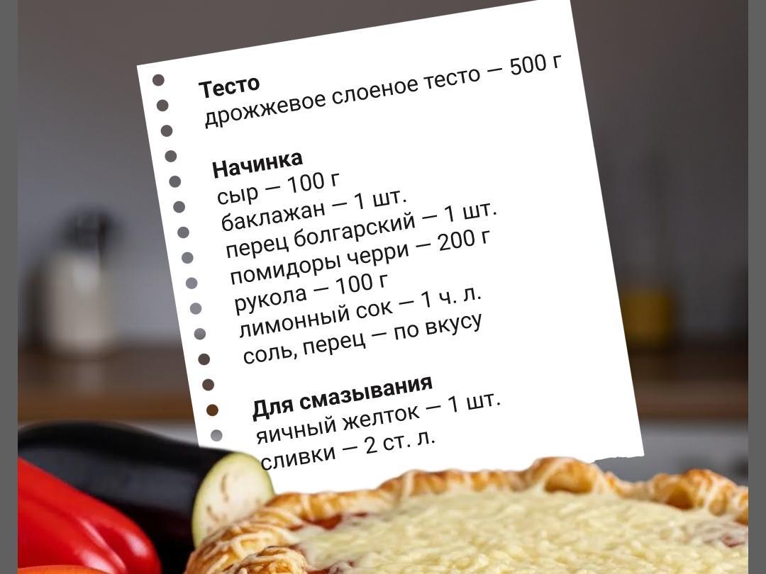 Line a baking sheet with parchment paper. Place the rolled-out dough on it. Brush it with yolk beaten with cream and a pinch of salt. Place sliced pepper and eggplants on top, cherry tomato halves, drizzle with lemon juice, salt, pepper. Bake in the oven for 15 minutes.