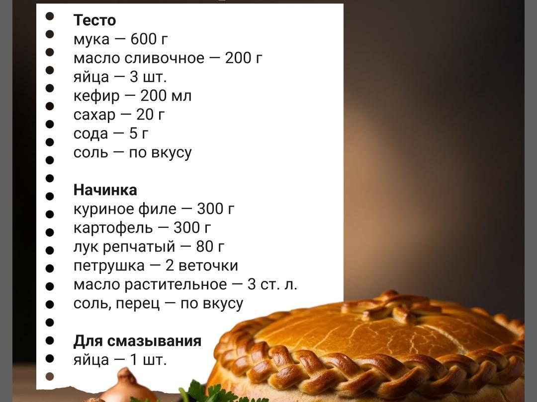 A chicken and potato pie baked in the oven is perfect for a family dinner. You can complement the dish with a vegetable salad. If you don«t want to make the dough yourself, you can use store-bought dough. Frying the potatoes is not necessary, but it will taste better.