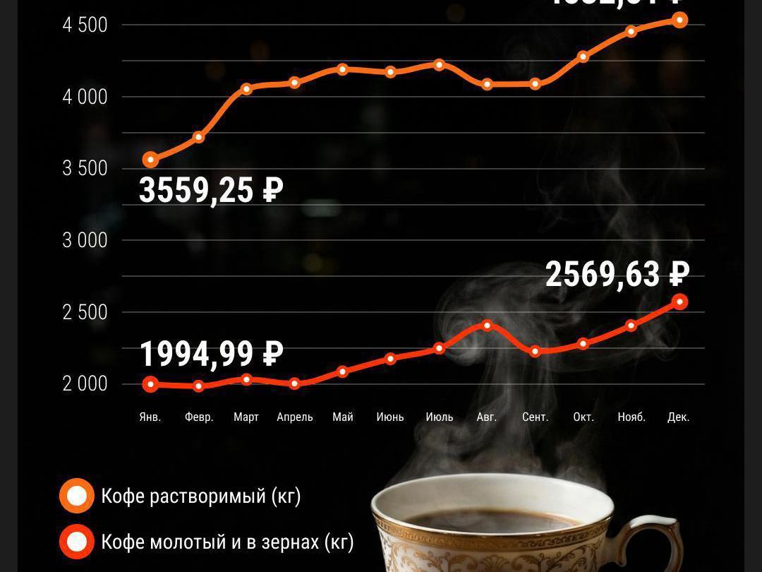 According to Rosstat data, in January 2025, a kilogram of instant coffee cost 3,600 rubles (approximately $36 at current rates). By December, the average price rose to 4,500 rubles (approx. $45), which means a 27% increase.