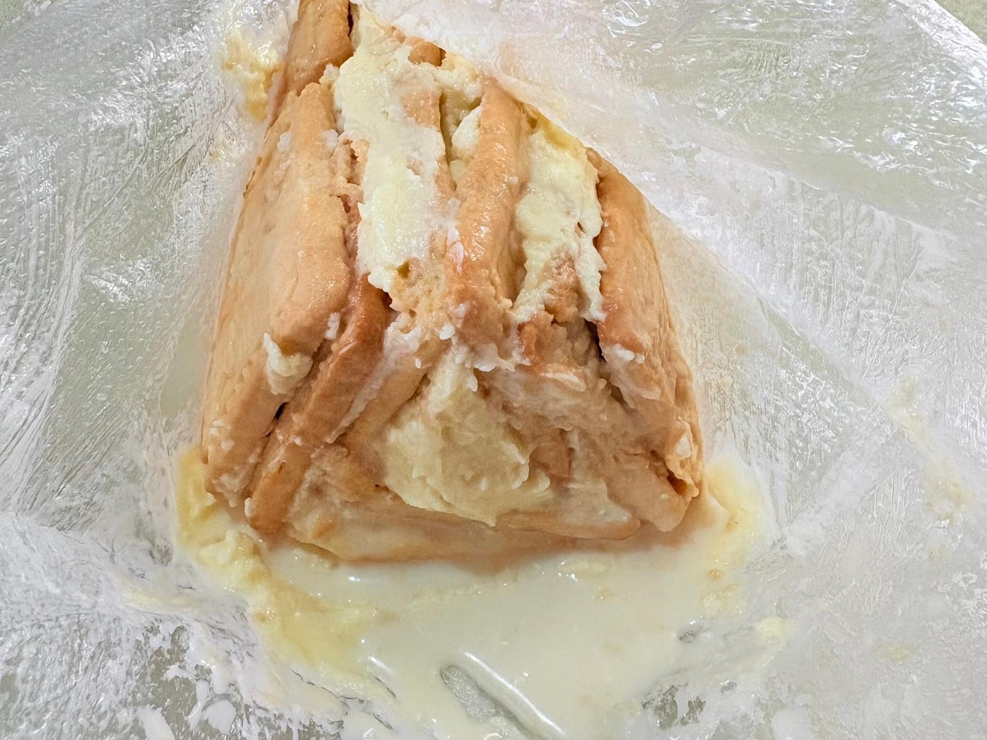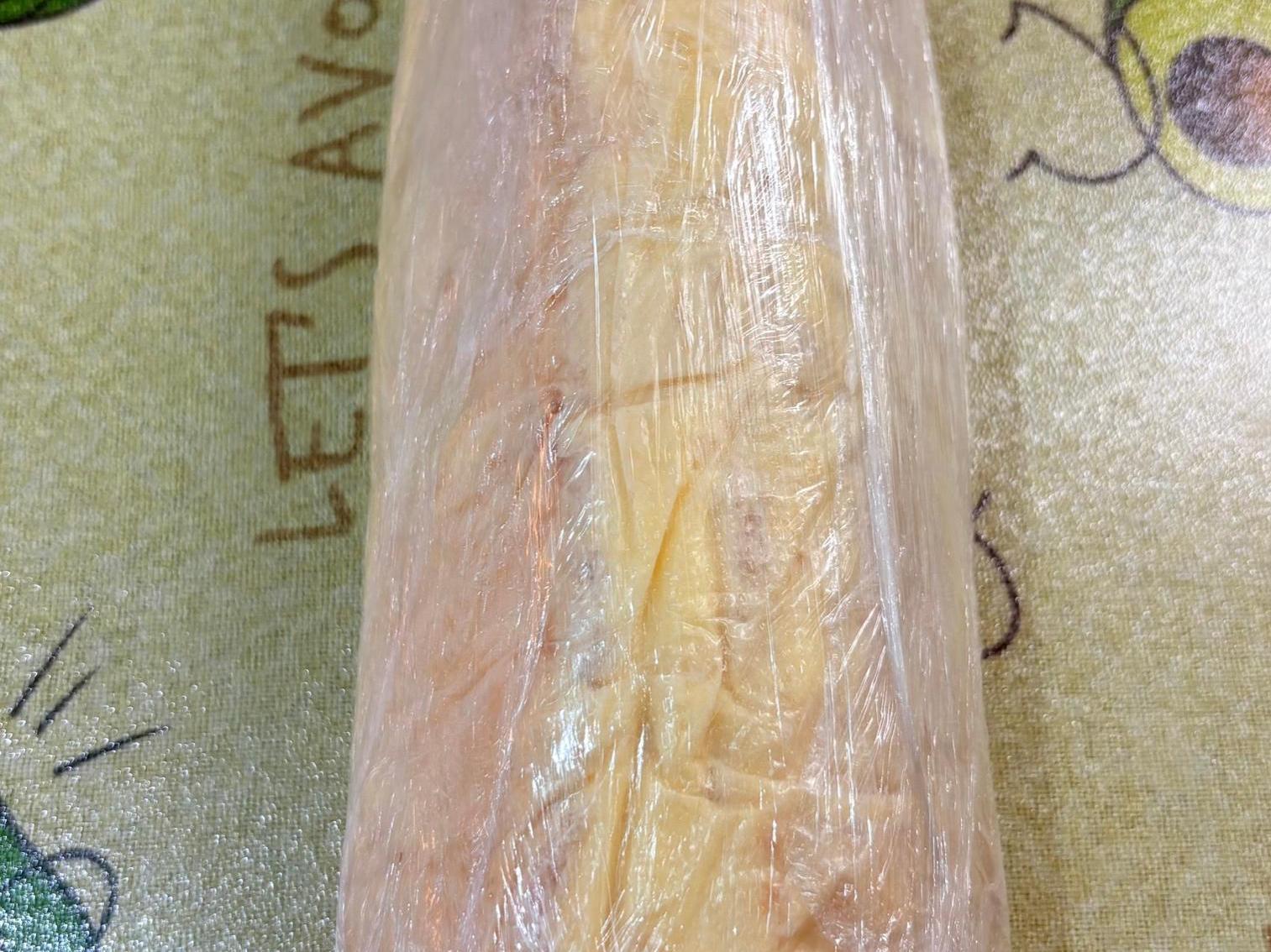 Using the bag, fold the outer rows so that it forms a »little hut« with the banana inside — a triangle. Wrap the bag tightly, you can additionally use plastic wrap so nothing leaks out and it holds its shape.