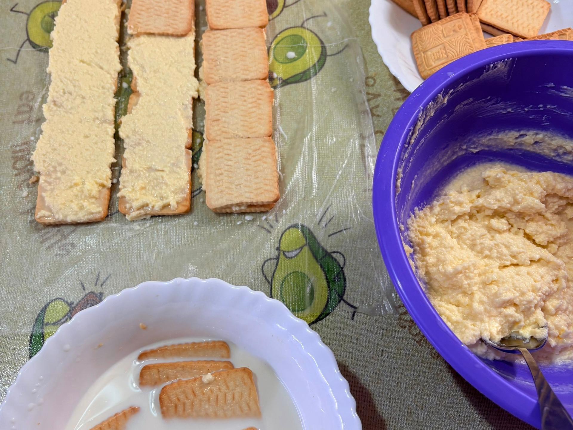 Spread with cream and repeat the layers of soaked cookies and cream. You need to make three layers of cookies and cream (the top layer is cream).