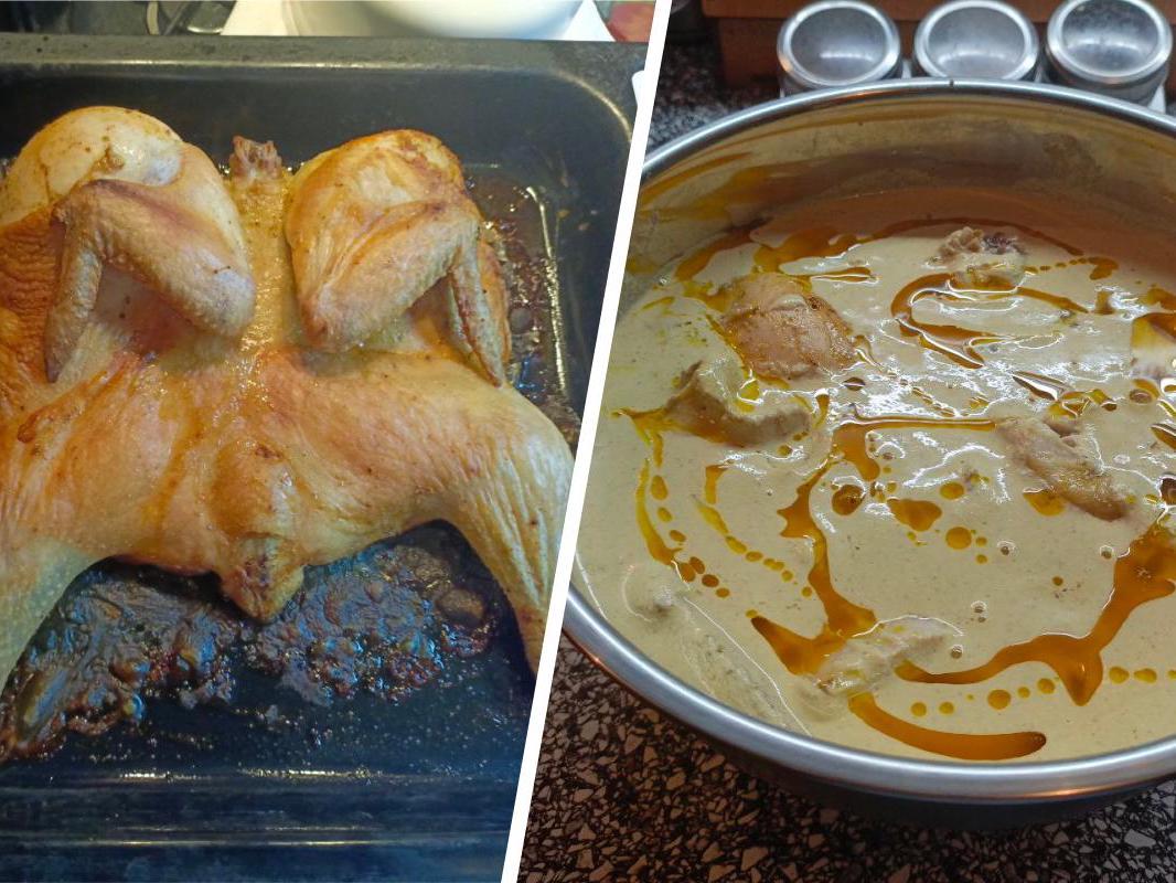 Check if the chicken is ready. If so, take it out of the oven and let it cool slightly, but not completely. It«s important that the poultry remains warm. By this time, our sauce will have settled.