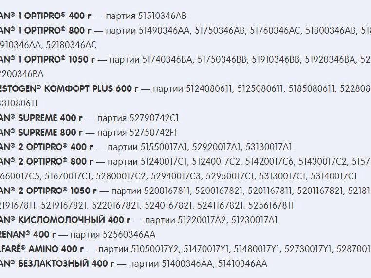 The import of formulas NAN 1 OPTIPRO, NAN 2 OPTIPRO, NAN Supreme, NAN EXPERPRO, NAN lactose-free, PreNAN, Nestogen Comfort, and Alfare Amino into Russia is prohibited.