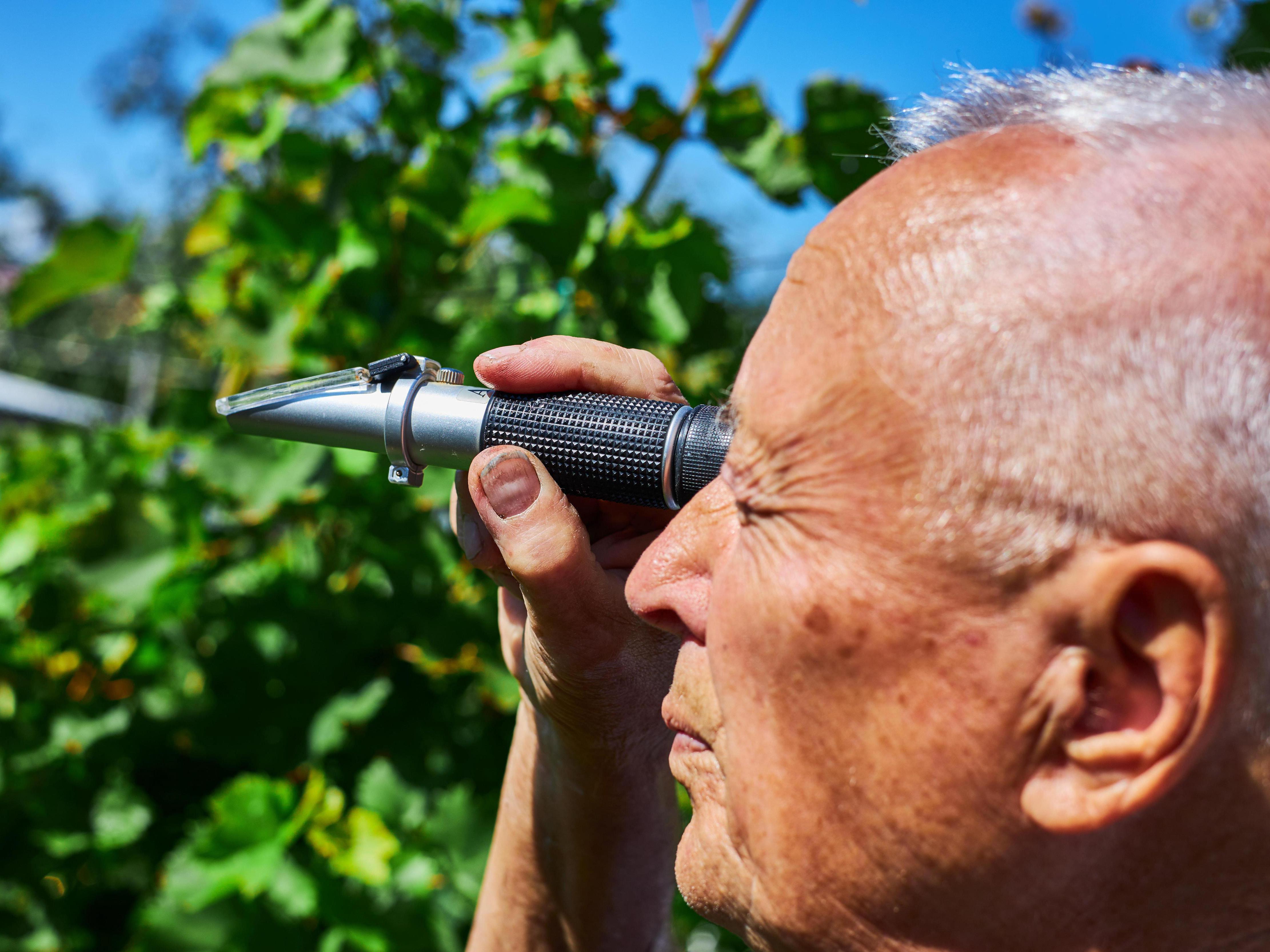To measure sugar in grapes, Yuriy Pavlovich has a refractometer. The device looks like a spyglass. You place a drop of grape juice on the sensor and look through the device to see what sugar percentage it shows.