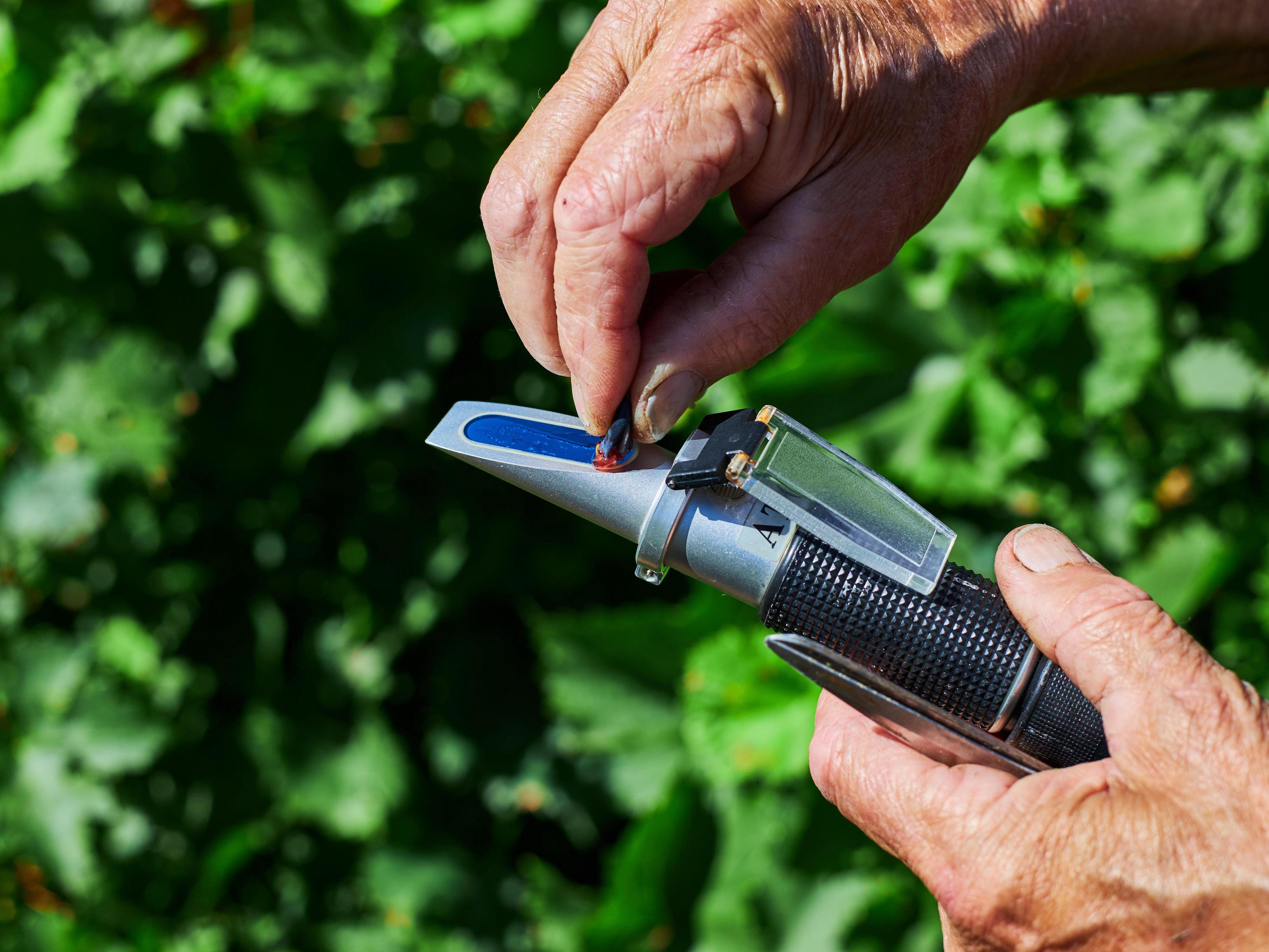 The scale shows grape sugar content, helping determine harvest timing and expected alcohol.
