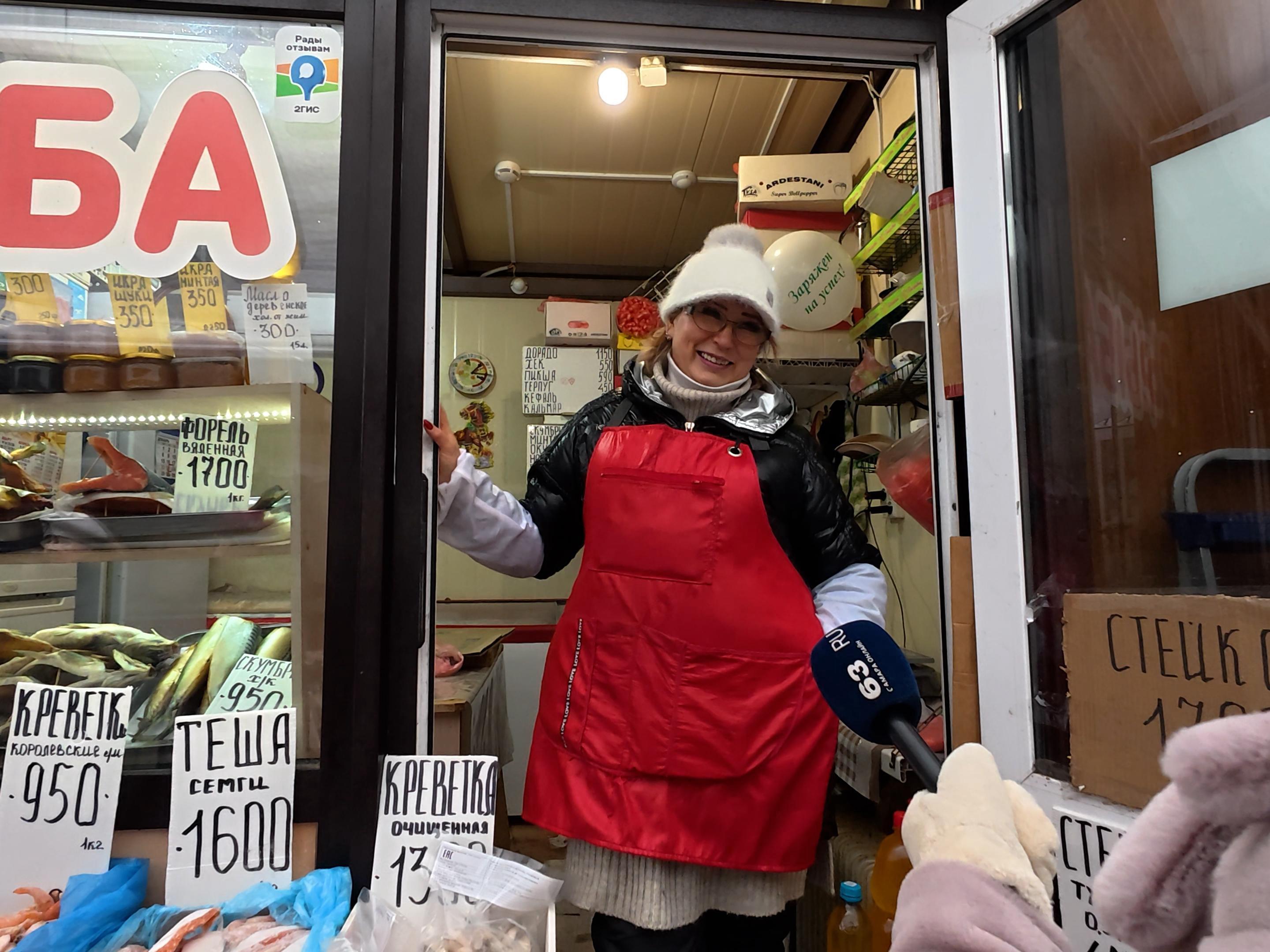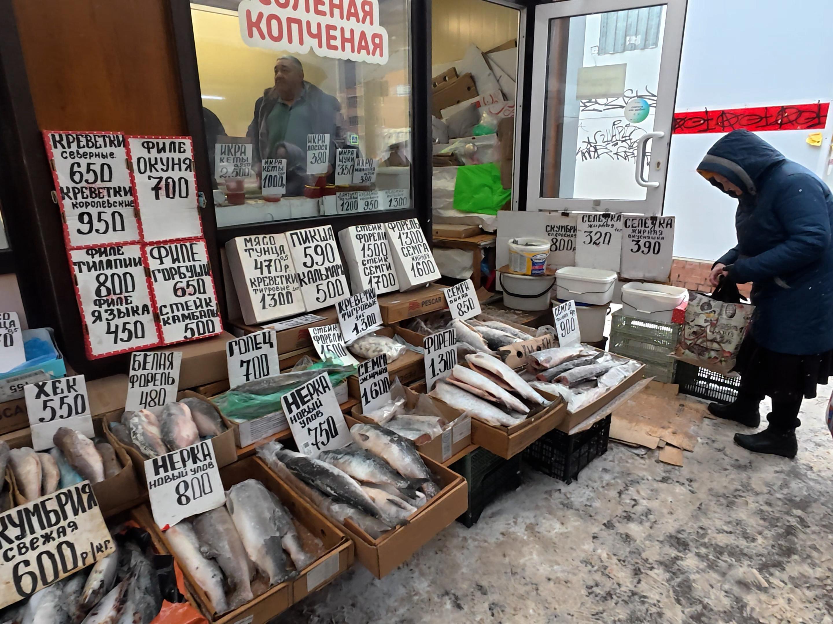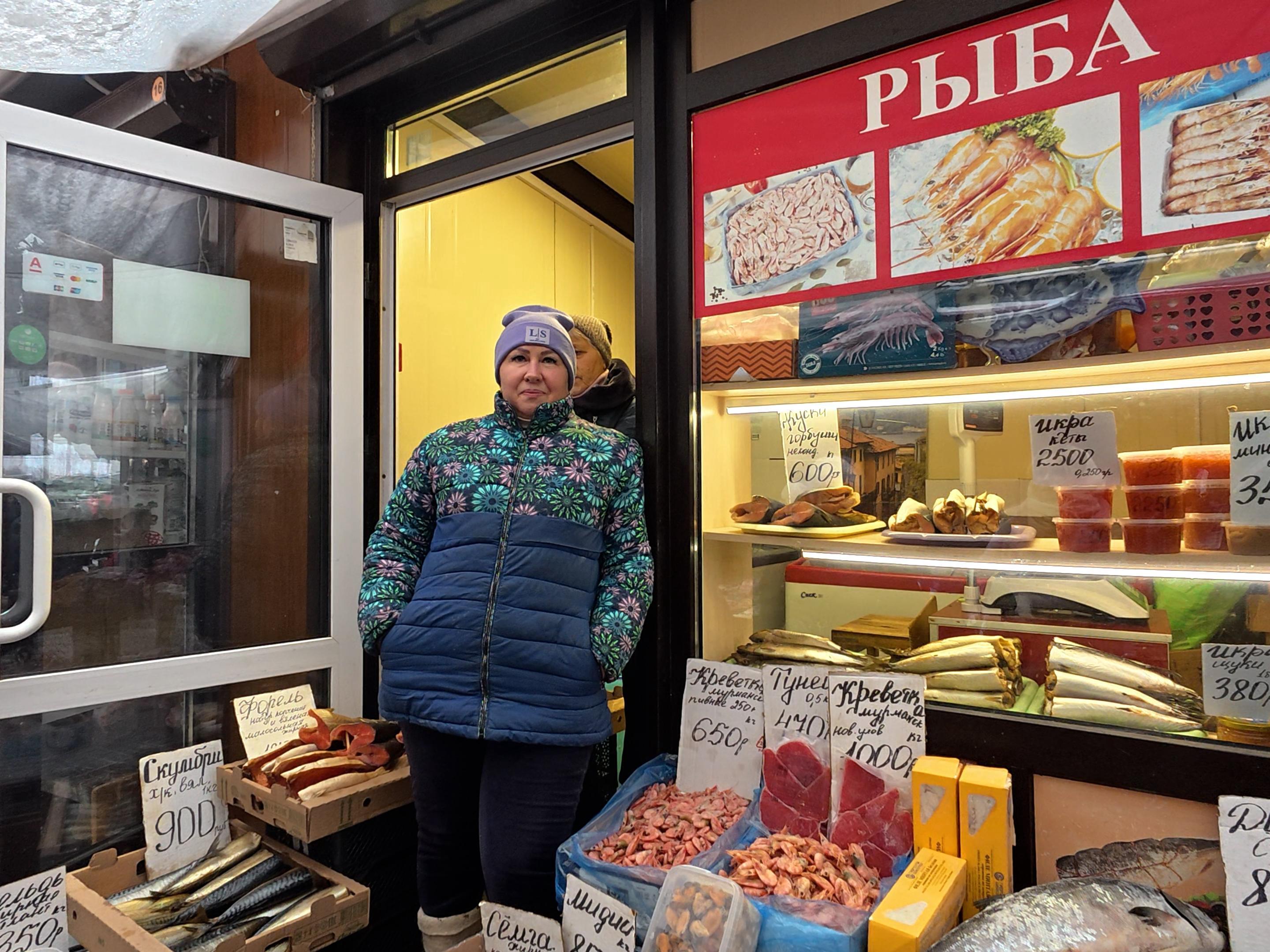 Seller Tatiana at one of the fish mini-shops does not complain about a drop in demand for her goods.