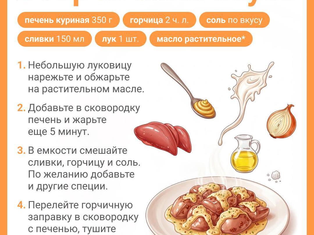 Chicken liver has a slightly sweet taste. It cooks very quickly. Literally just 8–10 minutes. Keep in mind that if you overcook the offal, a bitter taste may develop. We suggest preparing chicken liver in mustard sauce, which will perfectly highlight its flavor and turn a simple dish into an exquisite treat.