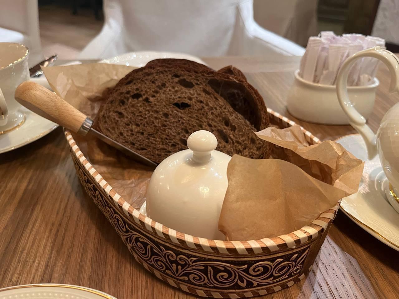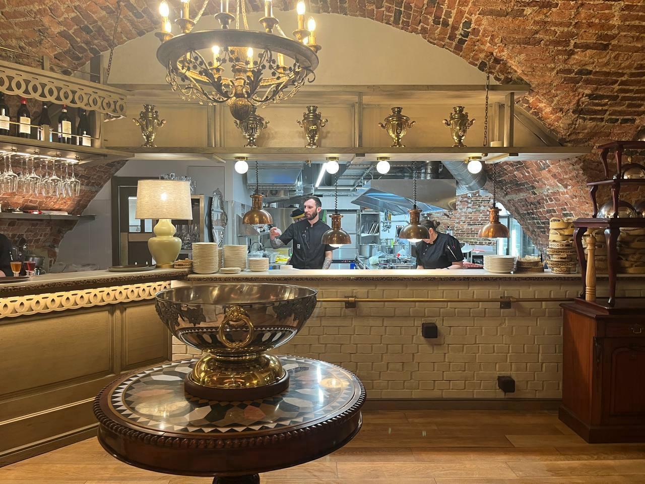 Chef Nikolai Oleinikov has compiled an extensive menu with deliberately archaic names. For example, «baked bone marrow» costs 790 rubles (approx. $9 at current rates), and «pâté from the liver of virgin chickens» costs 510 rubles (approx. $6). Prices vary: blini (4 pieces) cost 310 rubles (approx. $3), a side of White Sea halibut costs 1650 rubles (approx. $18). A glass of wine costs from 590 to 1090 rubles (approx. $7-$12), a portion of nastoyka (herbal vodka) costs 320 rubles (approx. $4).
