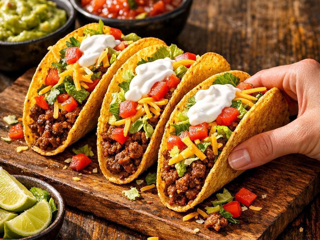 Warm crispy tortillas, ground meat fried with spices, cool sour cream, crispy lettuce, and juicy tomato. Each taco is assembled individually, resulting in a very tasty dish.