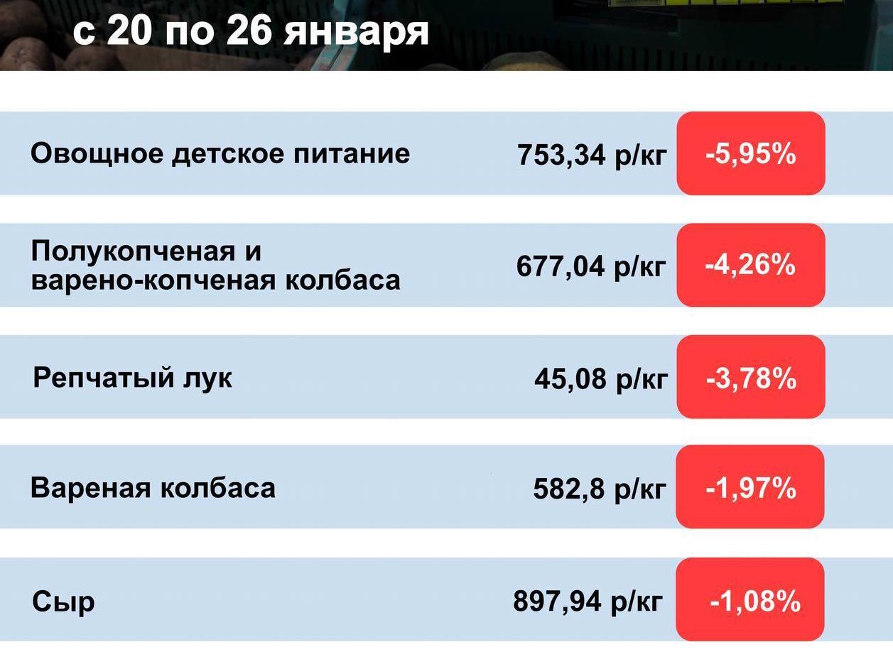 Price decreases were less pronounced than increases. This week, the leader in price drops was vegetable-based baby food. While not everyone buys this product, parents of young children will be pleased by the news. Its price fell by 5.95% to 753.34 rubles per kilogram (about $10 at current rates). Next was semi-smoked and boiled-smoked sausage (-4.26%) at 677.04 rubles (about $9 at current rates).