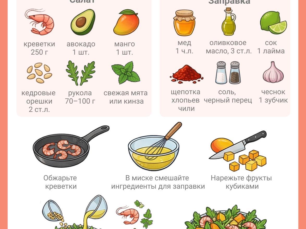 Looking for a recipe that will impress guests, adorn a holiday table, or become the highlight of a healthy lunch? This shrimp salad is the true embodiment of summer on a plate. It combines juicy tiger shrimp, creamy avocado, sweet mango slices, and the crunch of pine nuts. A lime-honey dressing with a pinch of chili ties all the ingredients together in perfect flavor harmony. Quick, elegant, and incredibly delicious — ready to start cooking?