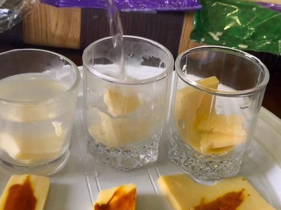 Cheese can be checked by dropping a piece into boiling water. If the product doesn«t melt, it»s best to avoid buying it.
