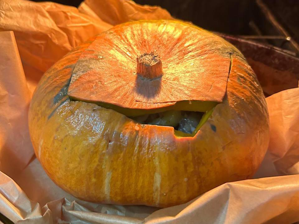 To prepare the dish, you will need a pumpkin, mushrooms, potatoes, cheese, garlic, cream, and a bit of patience.