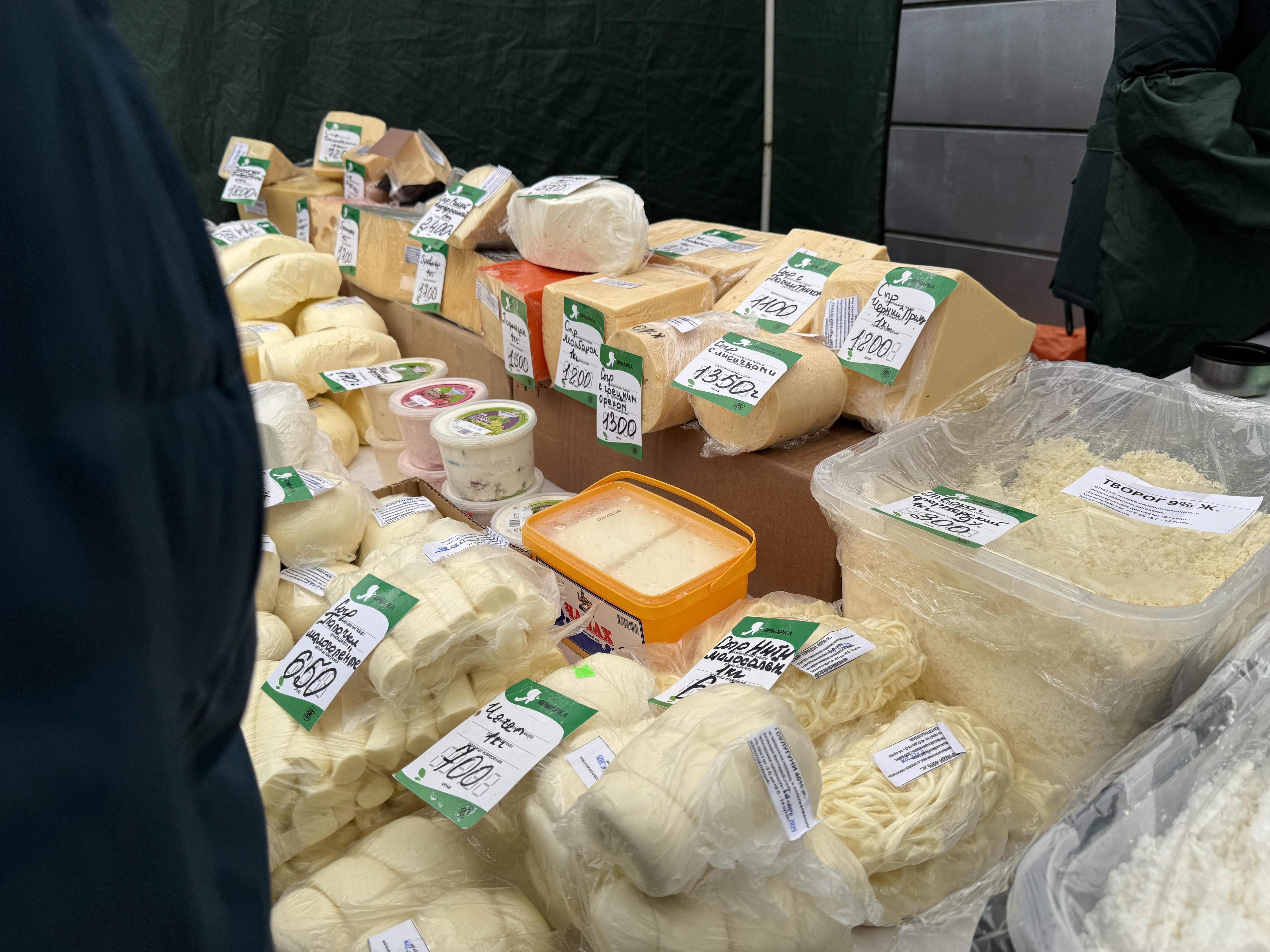A dairy stall is shown at the Krasnodar weekend fairs, highlighting the variety of products available.