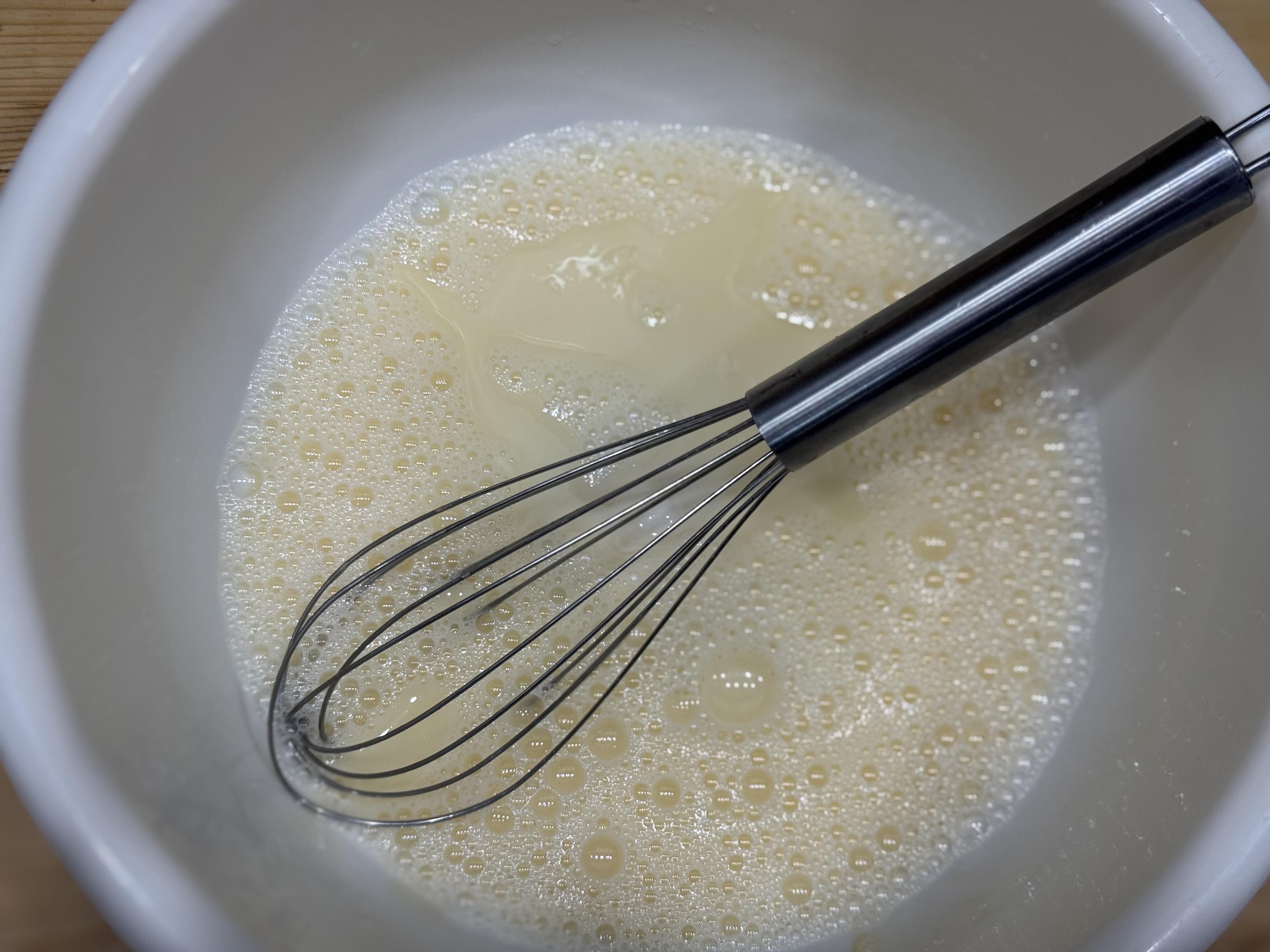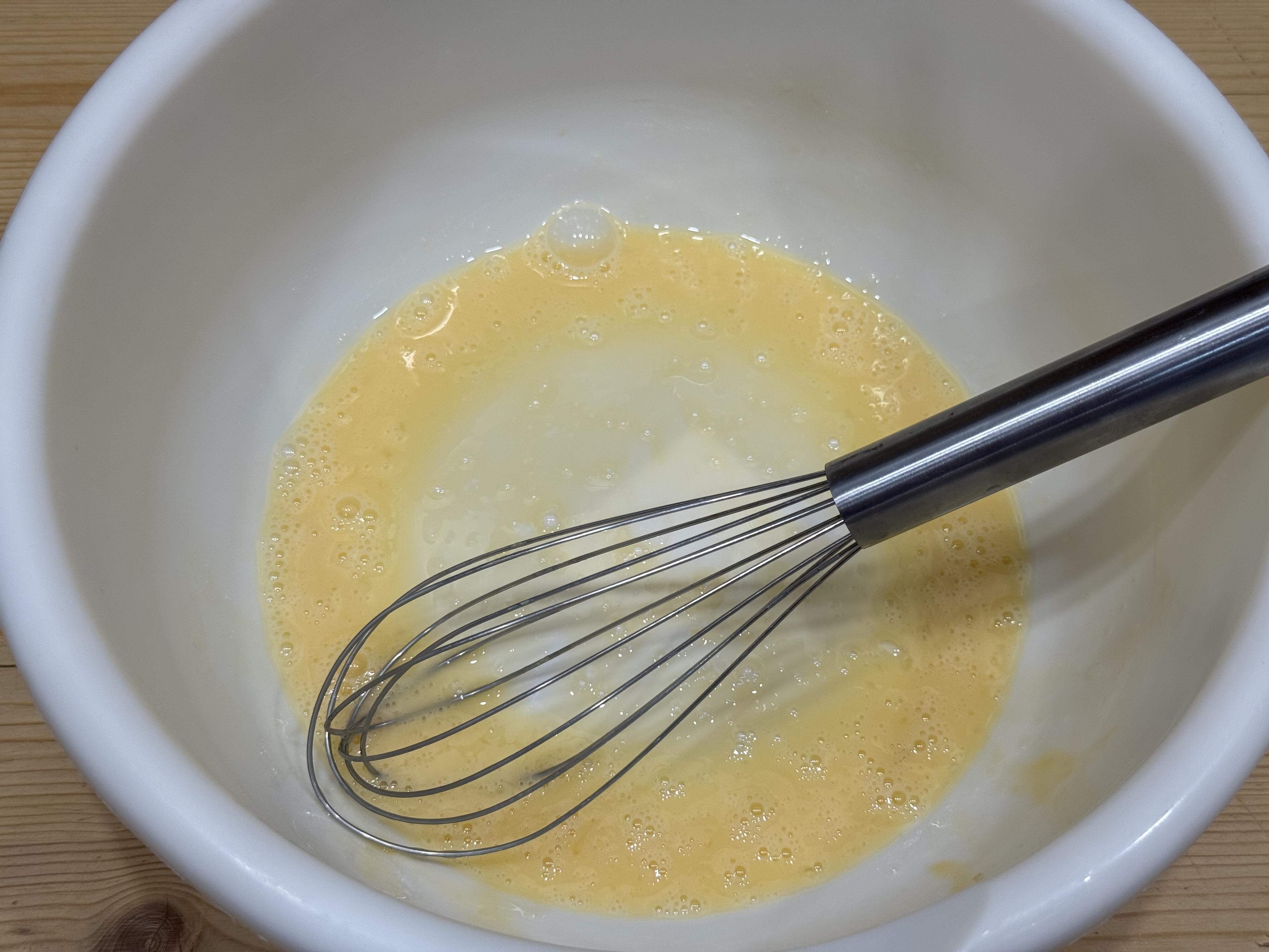 In a bowl, crack one egg and whisk with a whisk until light foam appears.