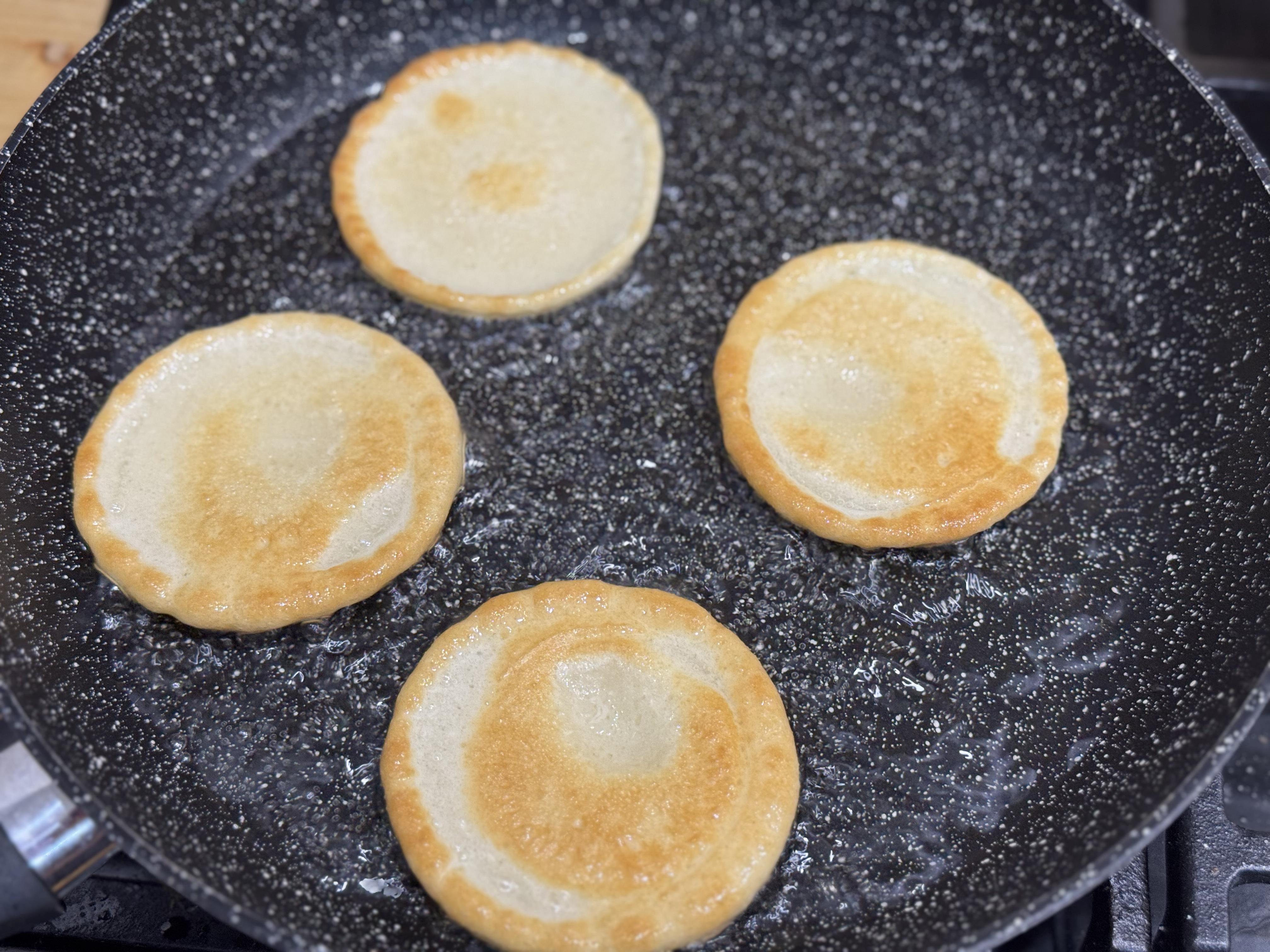 Flip with a fork, fry, and voila — the first batch of golden-brown pancakes is ready! Usually, I give the first pancake to my husband to check if others can eat it. Just kidding. Of course, this is done out of respect and love as the master of the house.