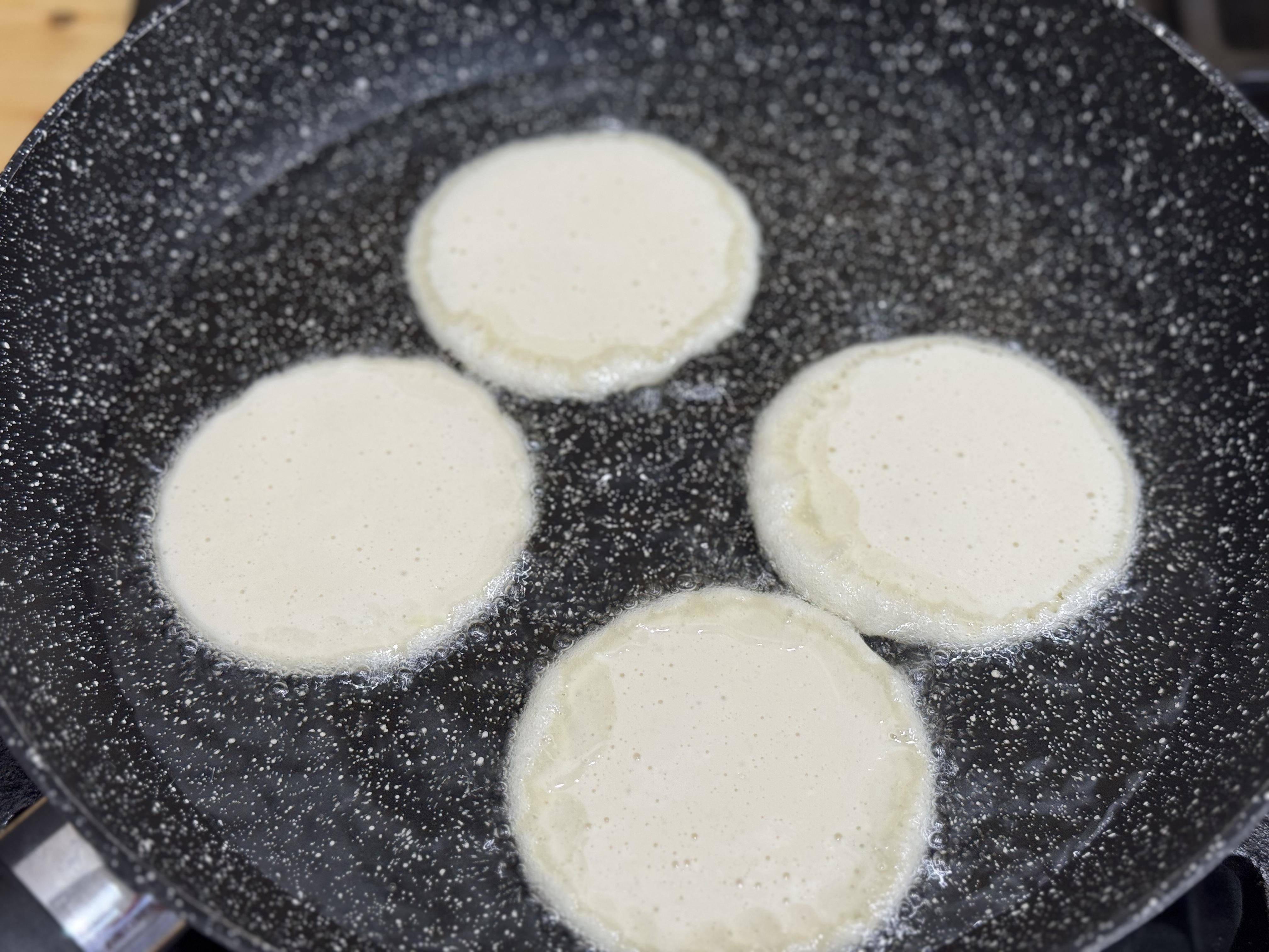 Pour a moderate amount of vegetable oil into a frying pan and set it on low heat to warm up, then start with the batter. Note that it should turn out like thick sour cream.