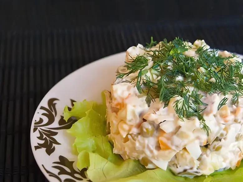 Cut the reindeer meat against the grain into cubes. Then sprinkle the meat with spices and let it sit for 10–15 minutes. After that, in a large bowl, combine the vegetables, egg whites, green peas, and meat, dress with mayonnaise, and mix. Ready!