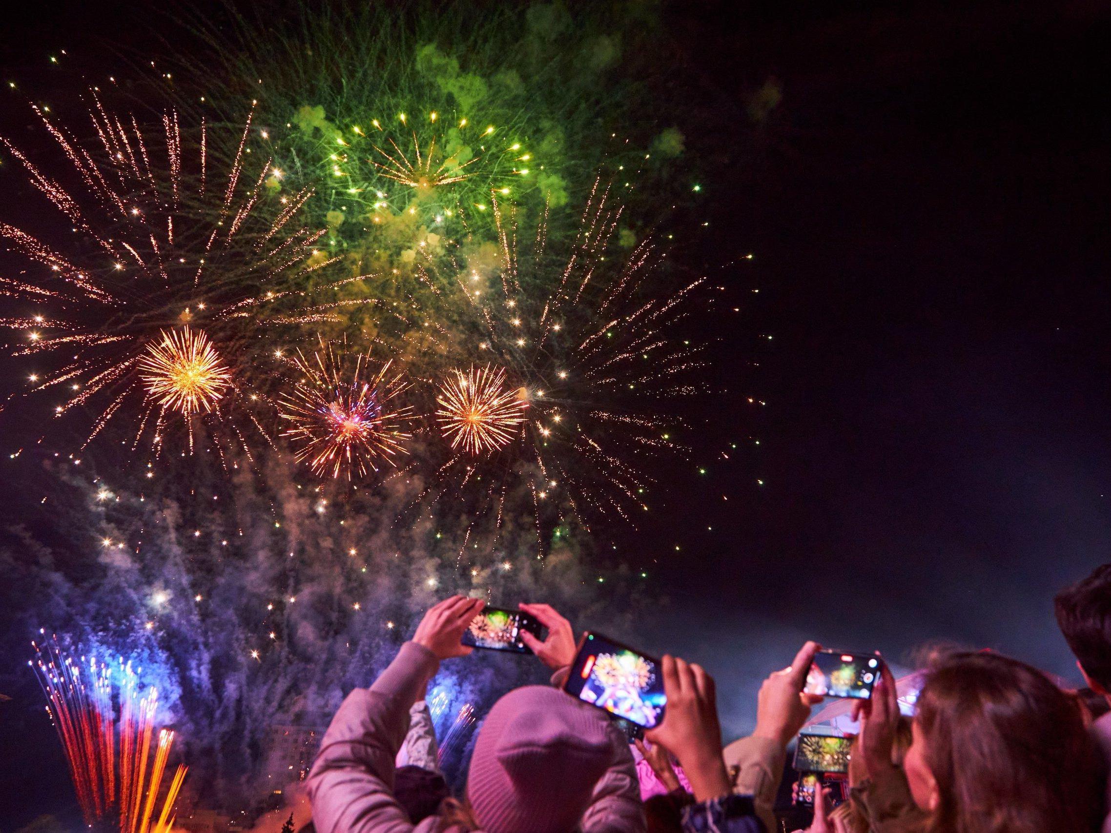 Fireworks from a holiday celebration light up the night sky in this photo.