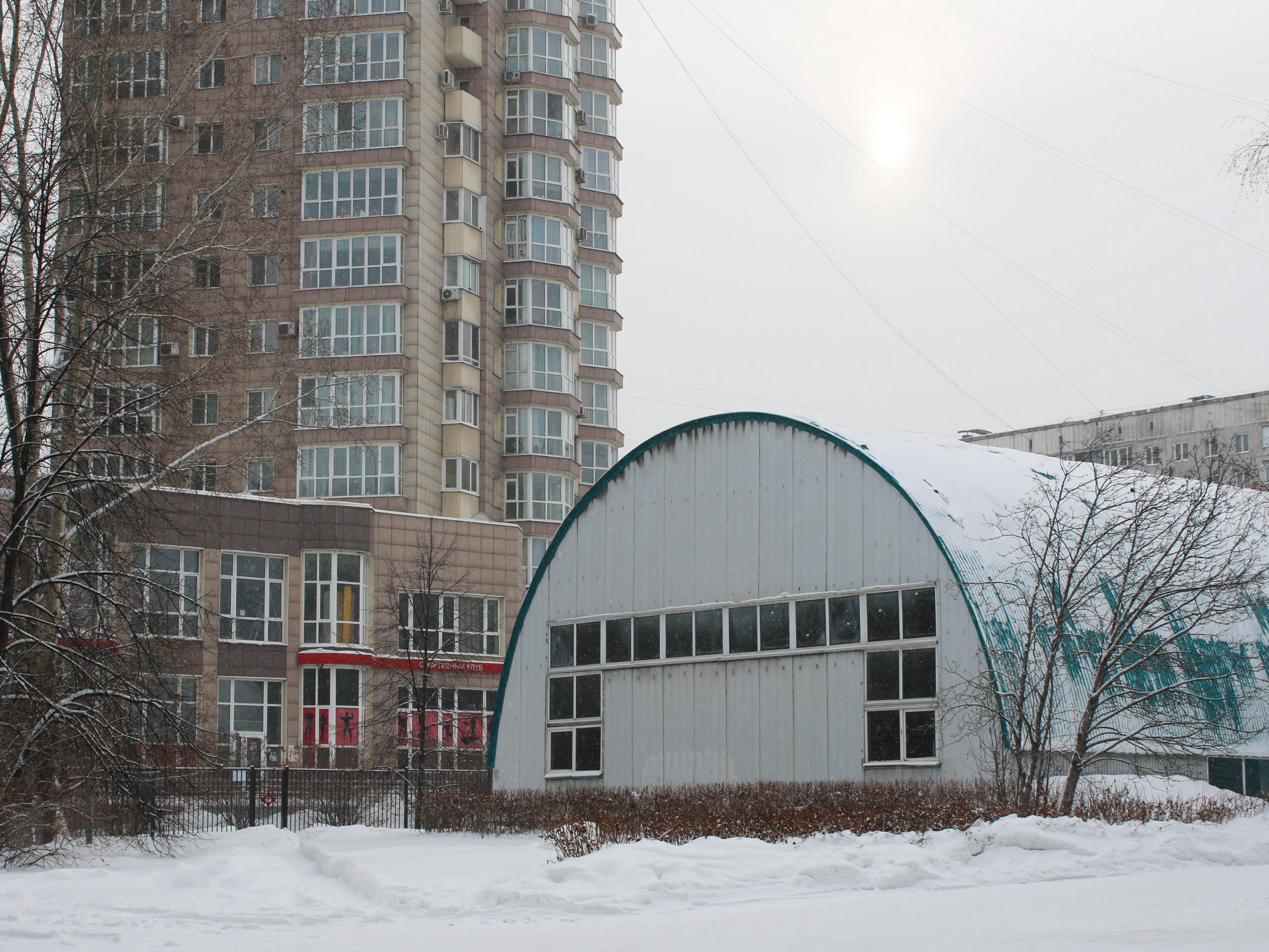 The «hangar» is an unofficial name for Sports School No. 6, located next to the residential complex, due to its external resemblance.