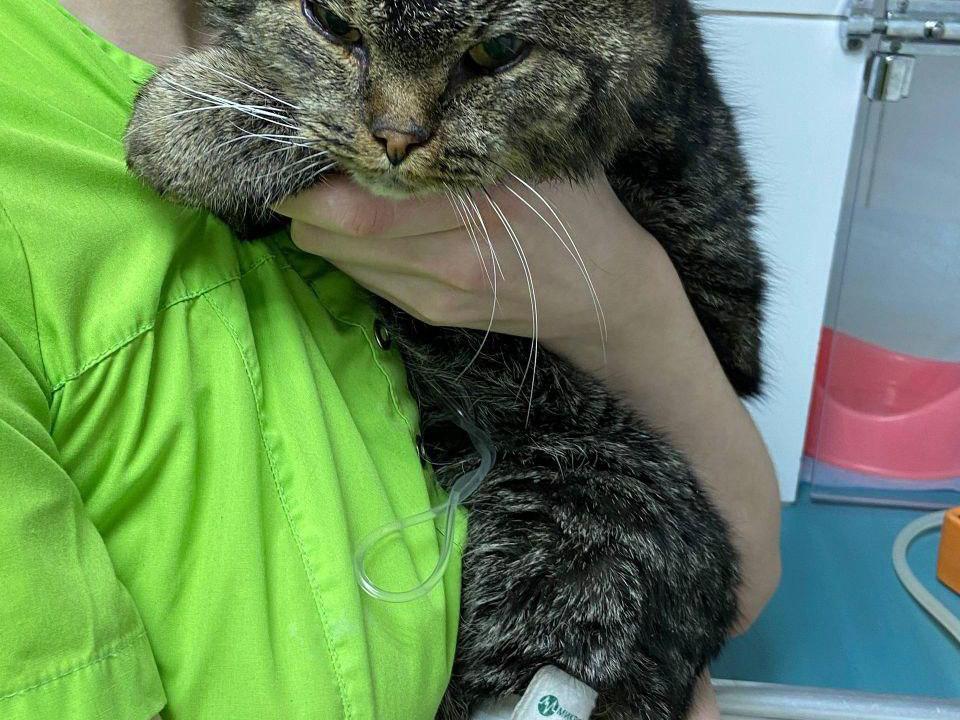 The cat was found on January 18. He was sitting on the doorstep of a car service center near the Kolkhozny Market and could no longer move from the cold. A concerned man noticed him, took the animal for an examination at a veterinary clinic, and called the cat shelter.