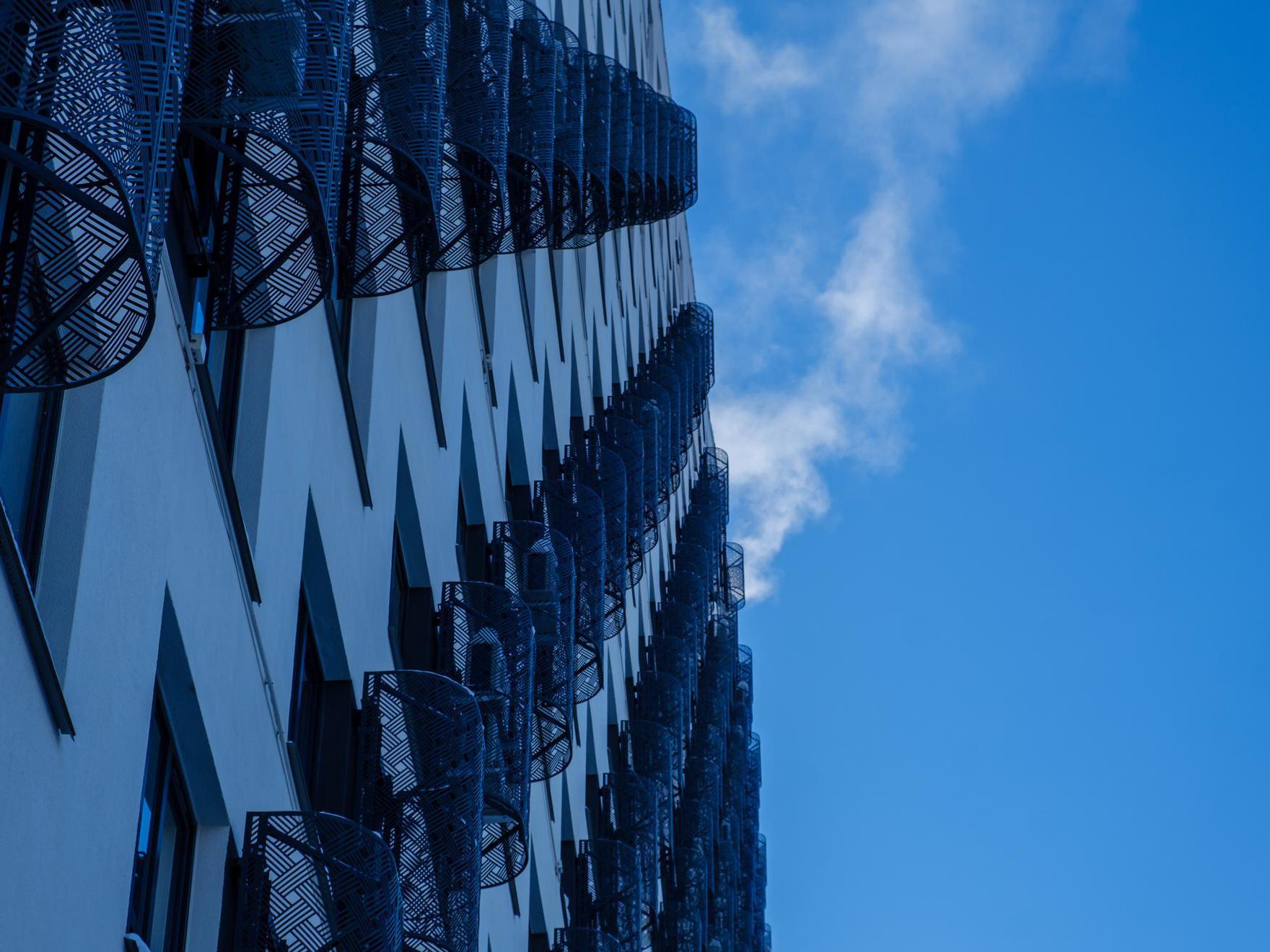 Its architectural solution is very interesting — the balconies are made not straight but as if sideways, which makes the building seem «sharp,» thereby attracting attention. But the whole trick is in the hinged panels, which, although used to reduce costs, create some illusion of complex architecture.