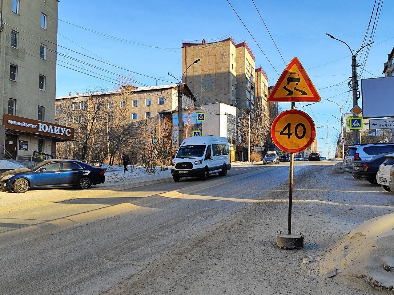A temporary speed limit sign due to slippery road conditions was installed over the weekend on Butina Street below its intersection with Balyabina Street in Chita, reports a Chita.Ru correspondent. The road has been treated with material, but on February 2, some vehicles continue to skid.