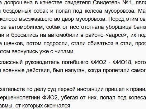 By chips, most likely, ear tags are meant. So think about it: the dogs, because of which a child died, were returned to the same place where they were fed by animal lovers, by officials after CNR procedures. This boy, running from a wild pack, came with his mother to Lipetsk from Lugansk, fleeing hostilities. His class teacher said in court that he still had fear inside: when planes flew by, he could start hiding. Otherwise, he was quiet and calm.