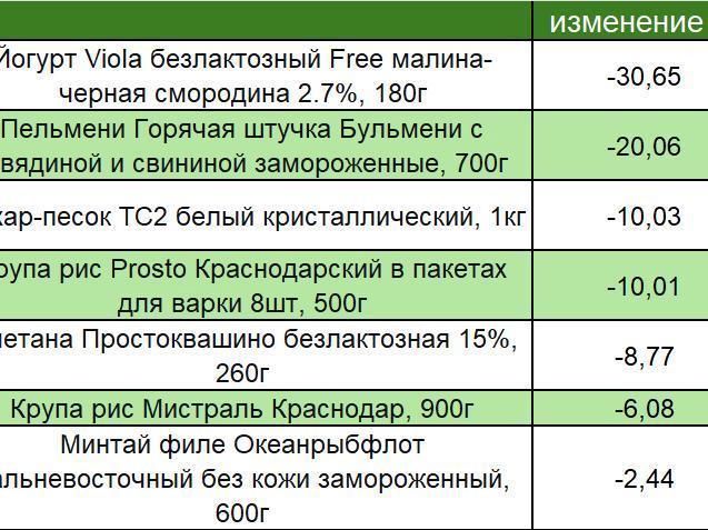 - yogurt — down 30.65%, to 74.9 rubles per package (about $0.80)