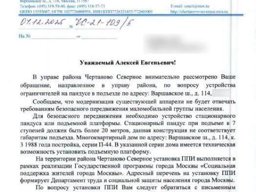 Alexei has no desire to put his sick elderly mother at risk, so he wrote an appeal to the Chertanovo Severnoye district office requesting that the ramp be made safe.