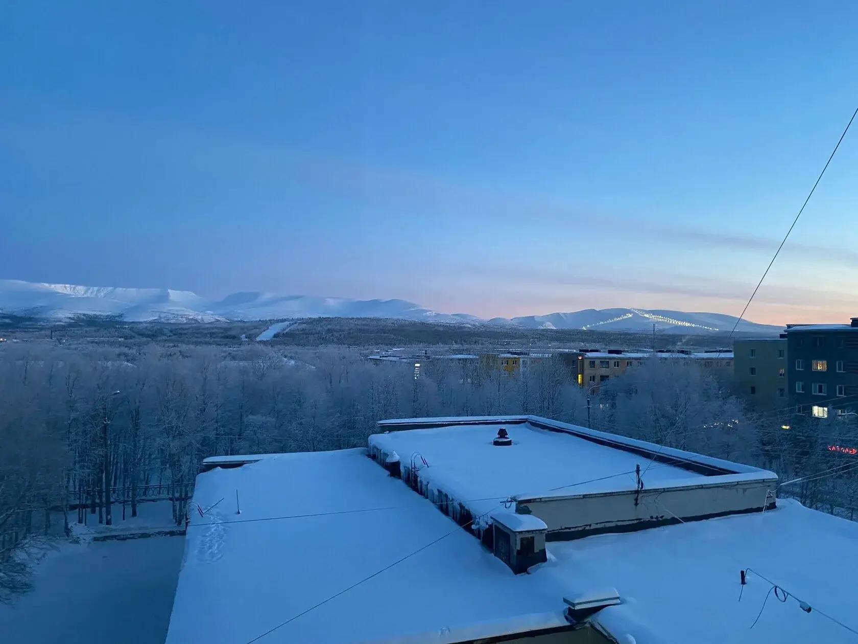 View from the apartment window in Apatity towards the Khibiny. You can see the illuminated ski slope. Local time 12:00—such is the polar night…