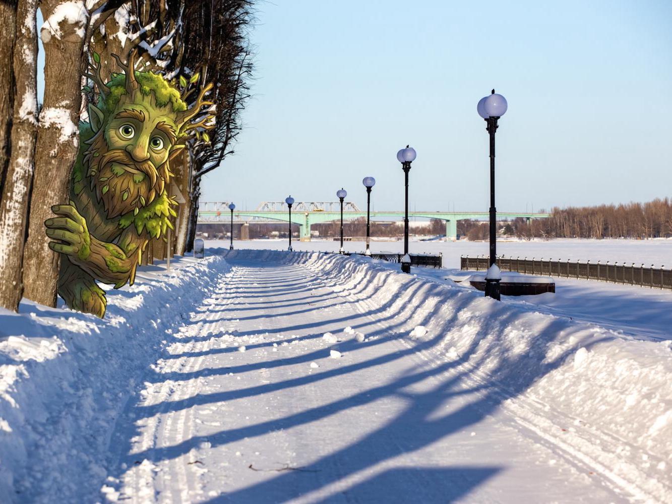 Leshy blends into the Volga Embankment, keeping watch over the trees« well-being in Yaroslavl.