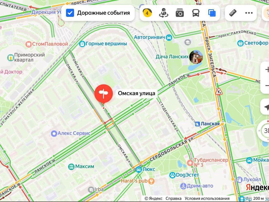 A map showing the intersection of Lanskoye Highway and Omskaya Street where the flooding occurred.