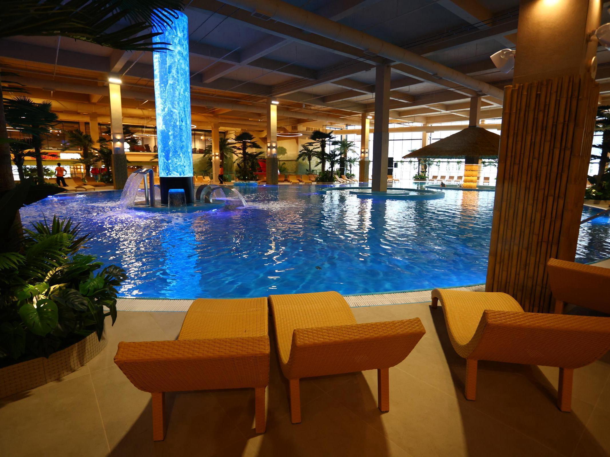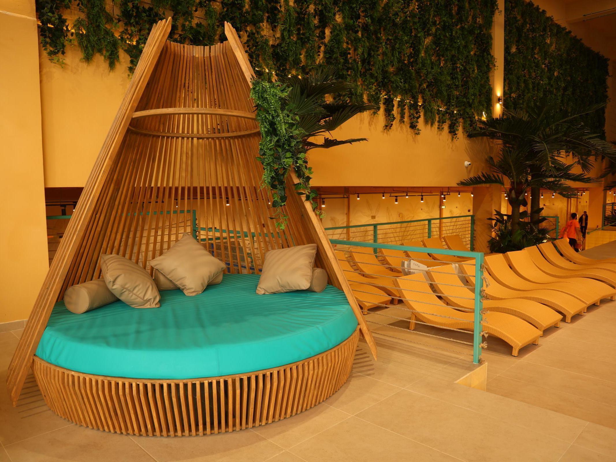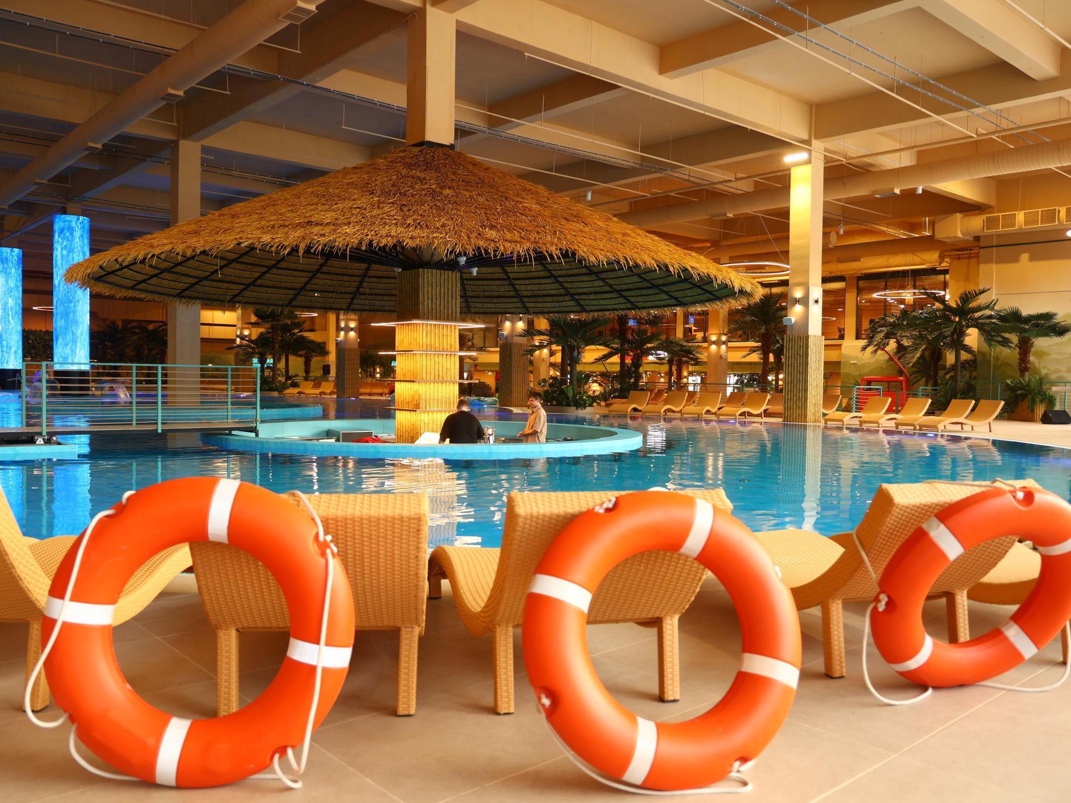 On the first floor, designed in a tropical style, there is a pool with an area of 1,200 square meters. For guests, VIP zones in the form of wigwams, a children«s spa zone with animators, and a panoramic sauna have been arranged. Aromatic steamings and wellness practices are planned to be held there, and the appearance of a karaoke bathhouse is also possible.